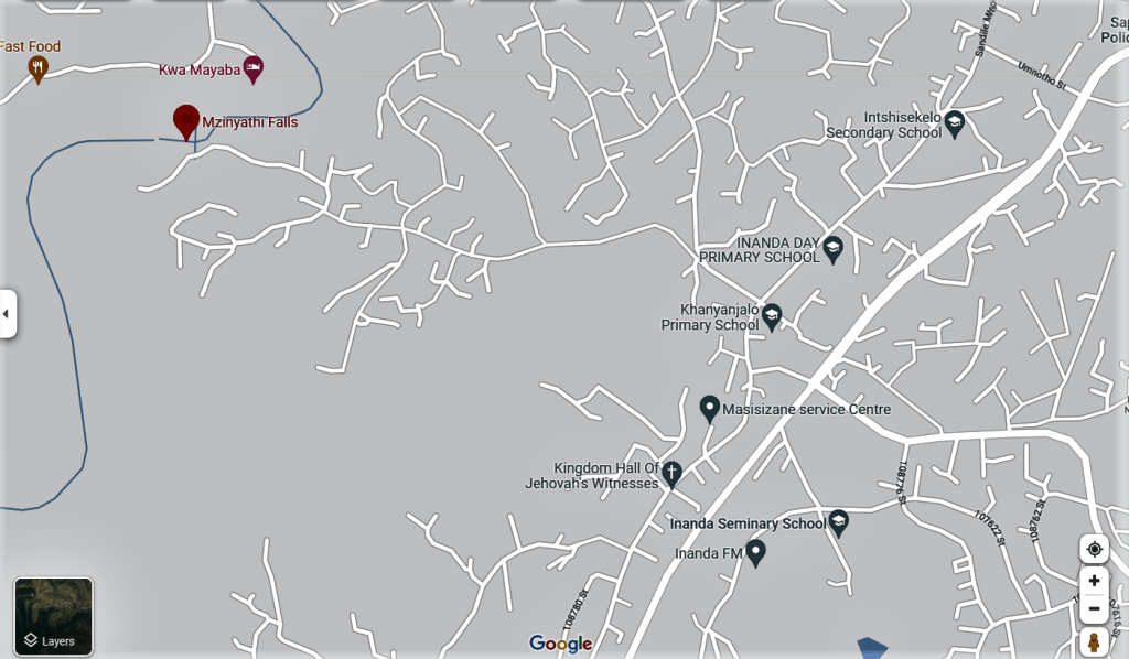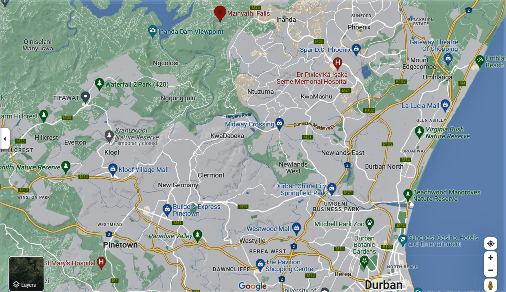 Mzinyathi Falls is little-known site that is a stone’s throw from Durban, (just about 20 minutes from the resort town of Umhlanga north of the city). Yet it gets very few visitors. Access to the falls (also spelled uMzinyathi) is not easy, as the last stretch of the way is a dirt road full of potholes and cracks.