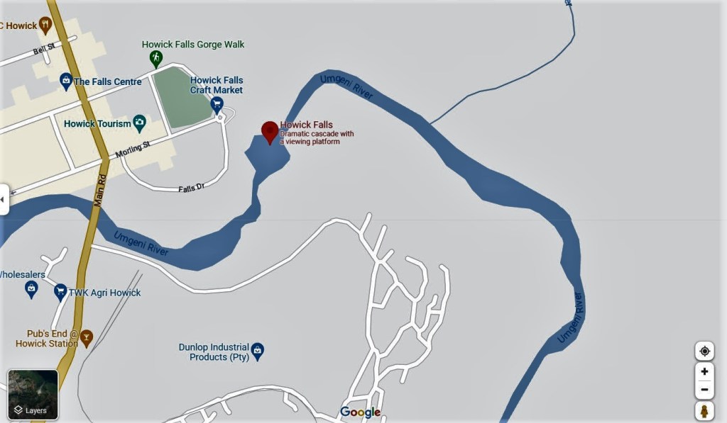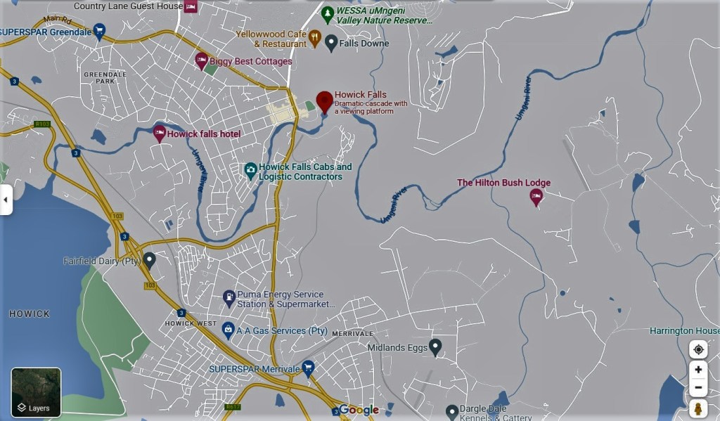 The old wagon road from Durban into the interior forded the Umgeni River just above the falls at Umgeni Waterfall Drift. A village was founded here in 1850; an inn was estabilished and a ferry operated and the village grew into the town of Howick. The geology around Howick is dominated by intrusions of Karoo dolerite that form the higher ground. They were intruded into flat-lying sedimentary rocks about 183 million years ago, at the same time as the Drakensberg lavas were being erupted. The sedimentary rock formations belong to the Ecca Group, the lower part of the Karoo Supergroup.
