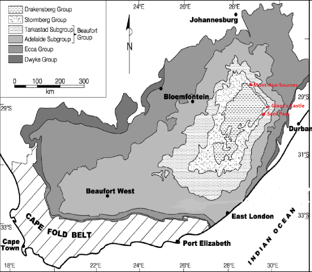 Imaged above, the pass is dominated by basalt lavas of the Drakensberg Group, the topmost volcanic layer of the Karoo Supergroup. These rocks are part of the far more extensive Karoo Igneous Province that covered much of southern Africa. Underneath the lava flows is the sedimentary Stormberg Group, at the top of which is the Clarens Formation.