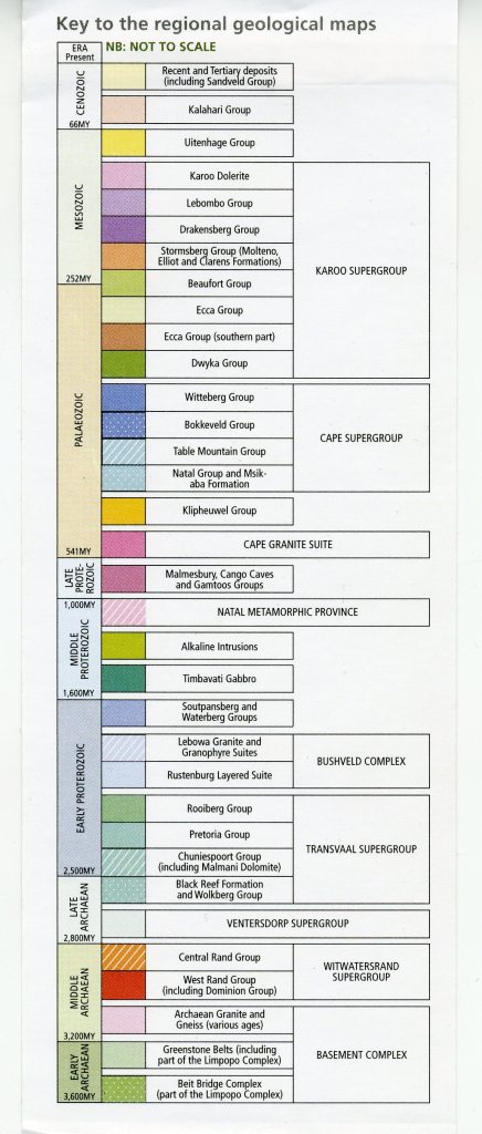 Pictured above, the uppermost formations of the Karoo Supergroup are seen here at their best. On top is a pile of basalt lavas, up to 1,500m thick, called the Drakensberg Group, and below that the horizontal and varied sedimentary sequences of the informal Stormberg Group. As mentioned before, geological ages range from around 183 million years for the lavas to more than 200 million years for the sedimentary layers.