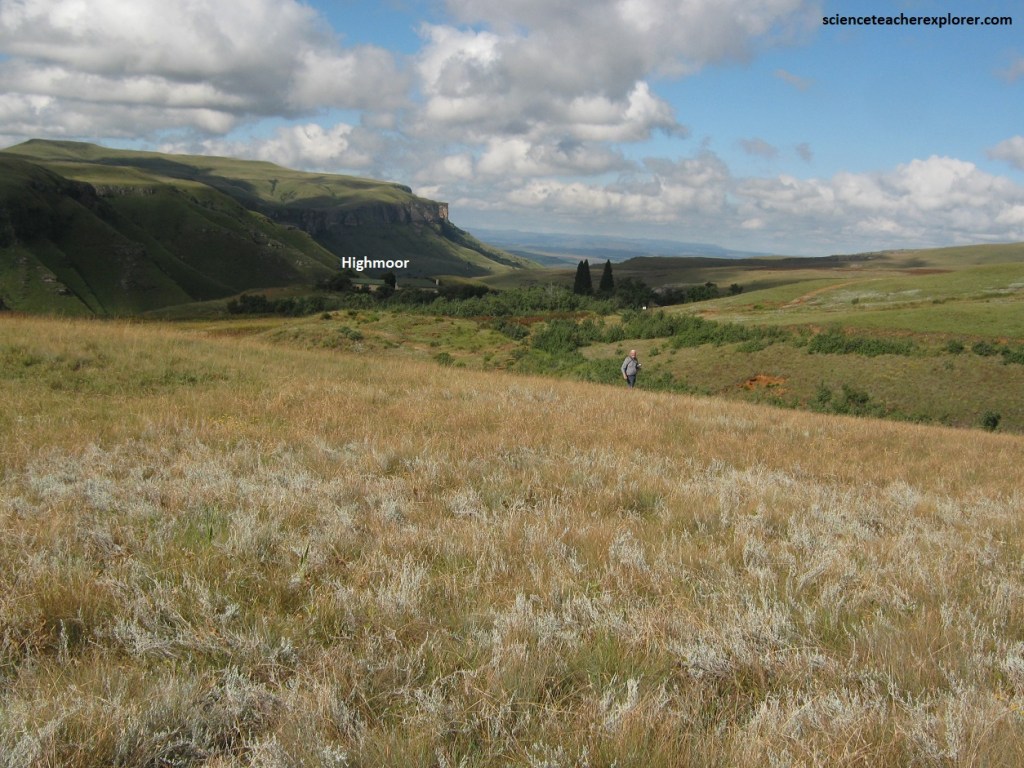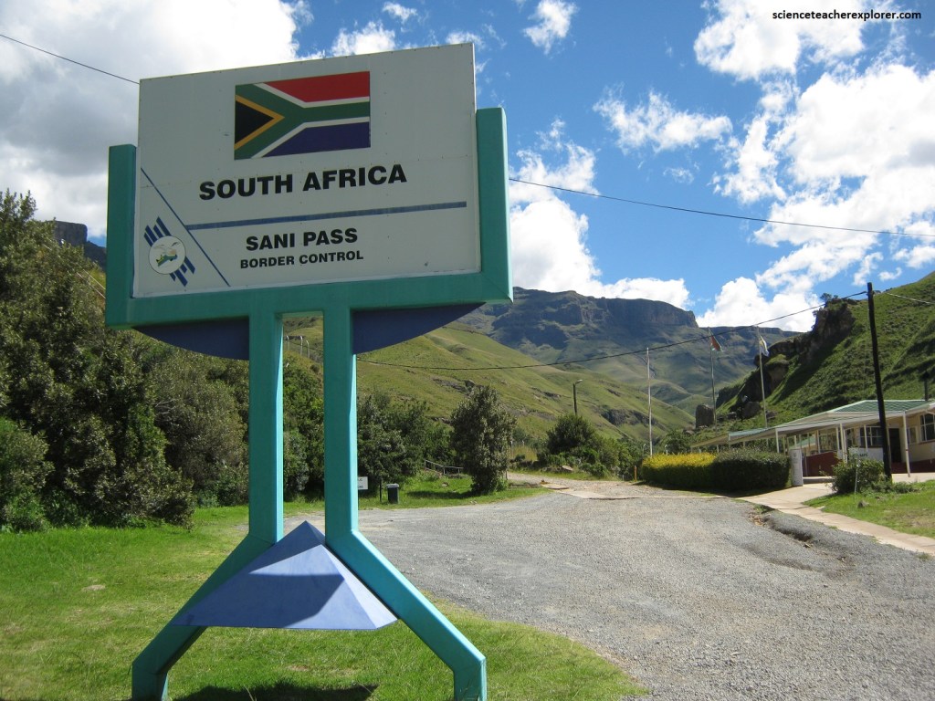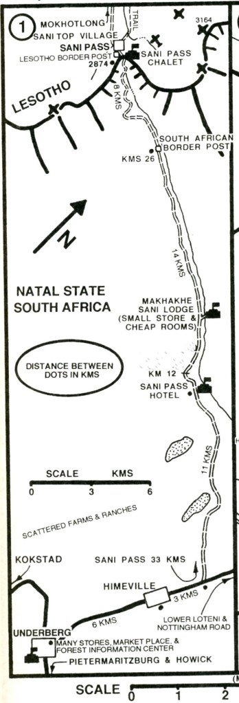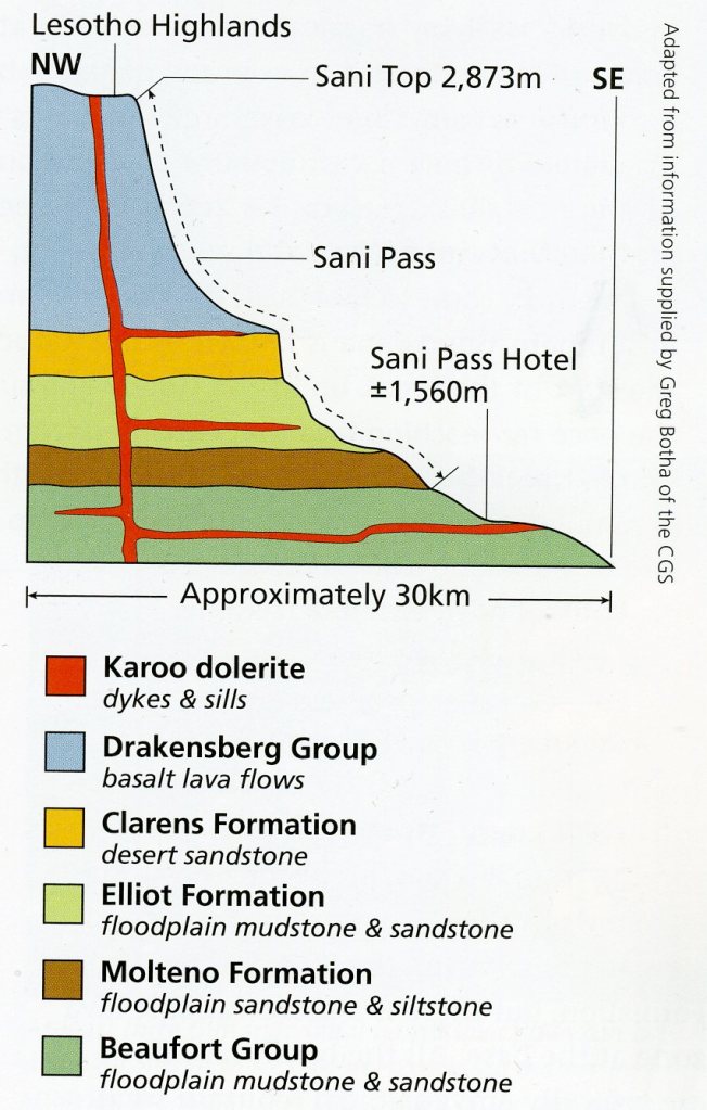 Pictured above, from Himeville, the Sani Pass road climbs through the full sequence of upper Karoo sedimentary formations and Drakensberg lavas to the top of the rugged Lesotho Highland plateau. The pass road starts some 25 km northwest of Himeville at the ruins of the “Good Hope Trading Post”, then passes through the border control post, where a passport is required.