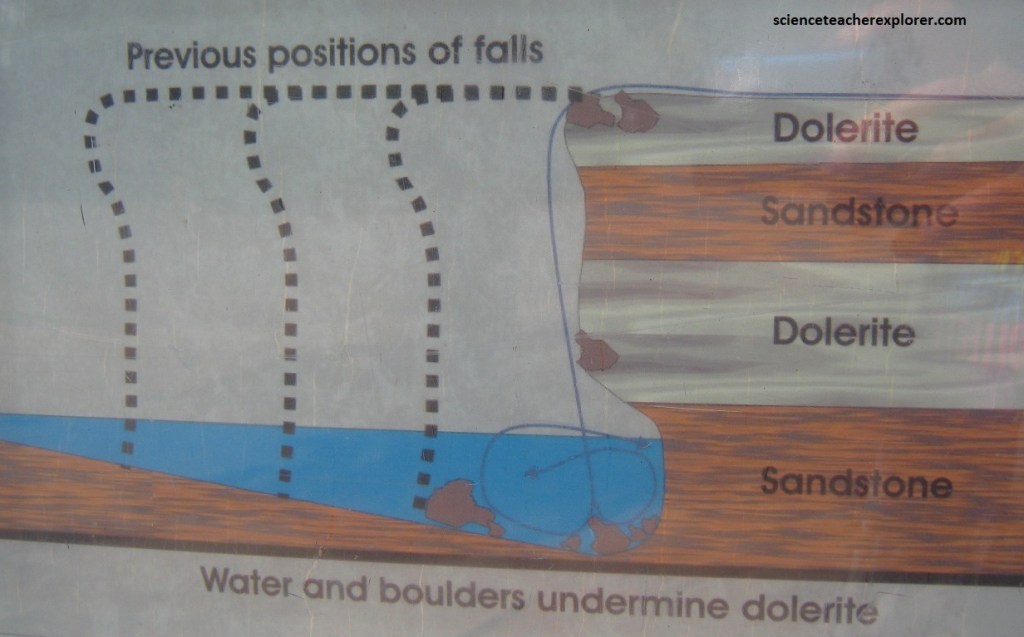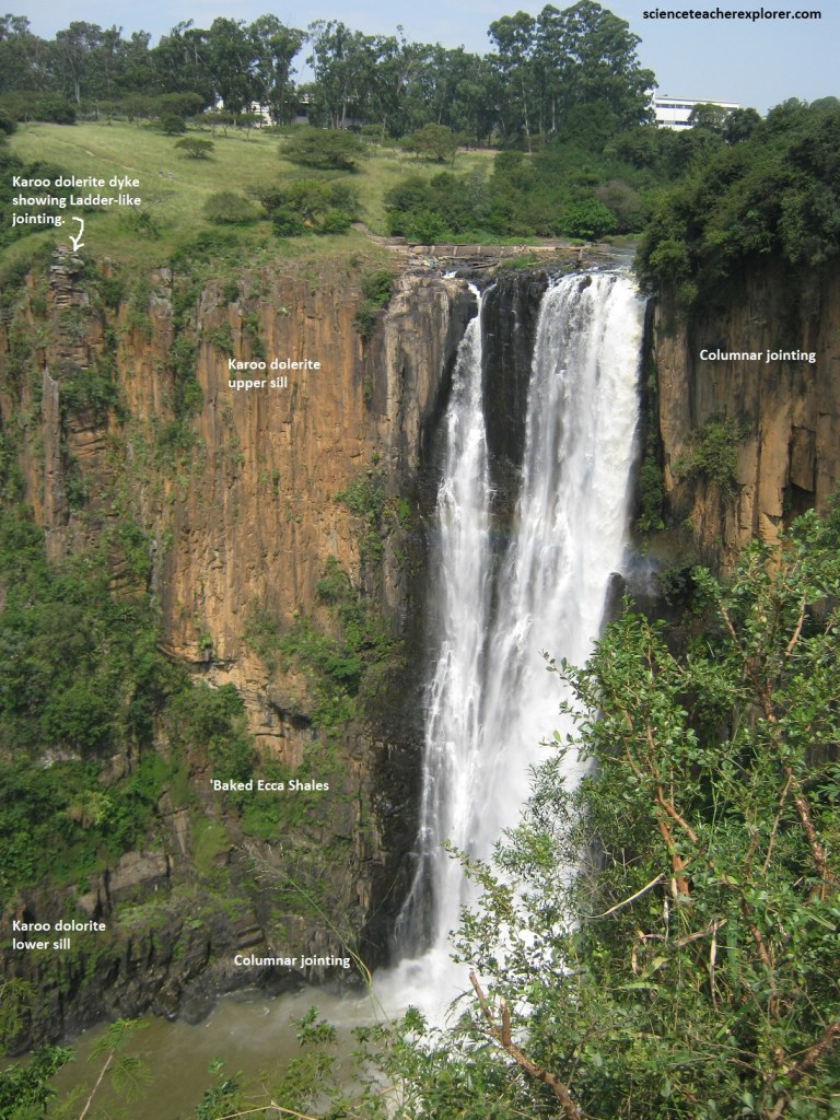 Imaged above, at Howick Falls the Umgeni river plunges 95 meters over a dolerite cliff into a gorge, creating the spectacular waterfall, (formed where strong head-ward erosion by the river was arrested by the more resistant thick dolerite sill), the position where the river has had its erosion profile re-adjusted. In the photo above, note the Karoo dyke that is visible on the far side that is a narrow vertical dolerite dyke that was possibly a feeder channel for the Drakensberg lavas, but postdated the sill. The dolerite sill was formed by molten magma that forced its way into pre-existing horizontal beds of Ecca Shale and some sandstone layers. About halfway down the cliff there is a 25 meter thick, horizontal layer of dark shale that has been strongly baked and hardened by heat from the dolerite intrusion above.