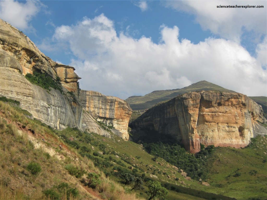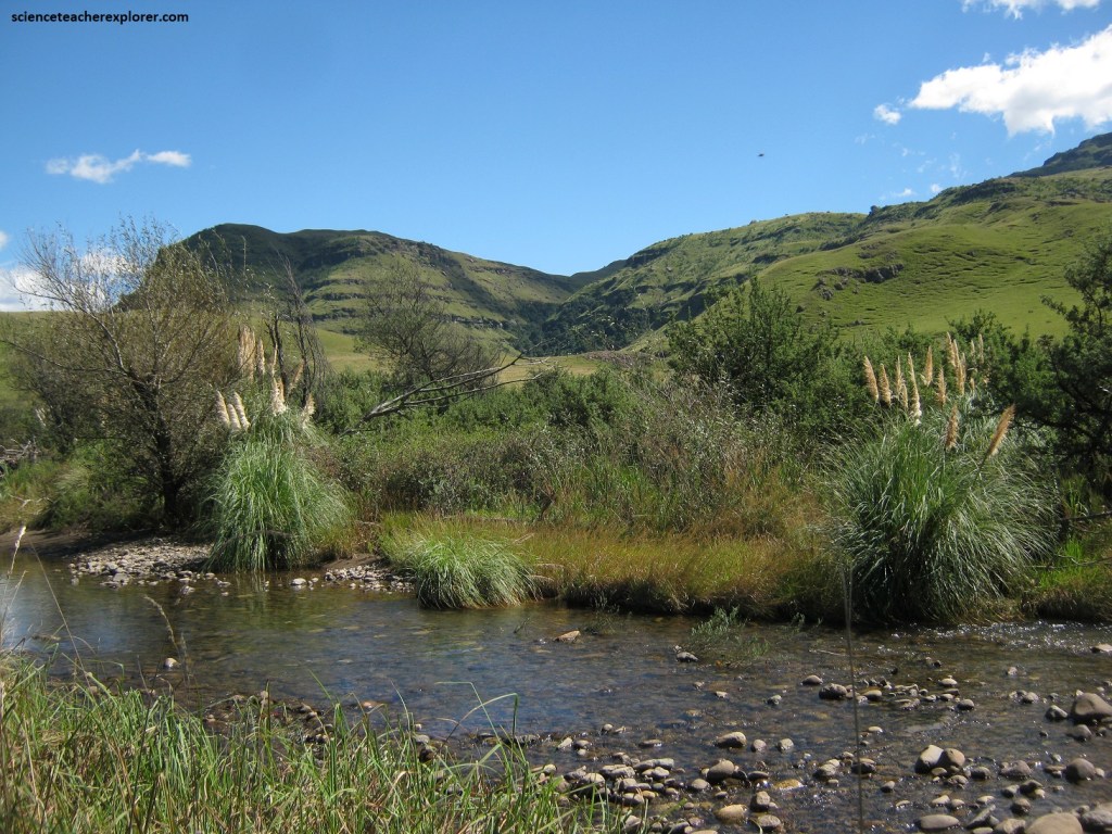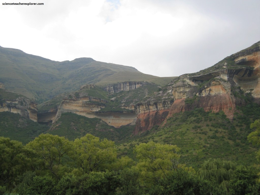 Well-bedded sedimentary rocks, mainly alternating sandstones, siltstones and mudstones of the informal Stormberg Group and upper Beaufort Group, underlie the Clarens sandstone in the incised Mkhomazana River.