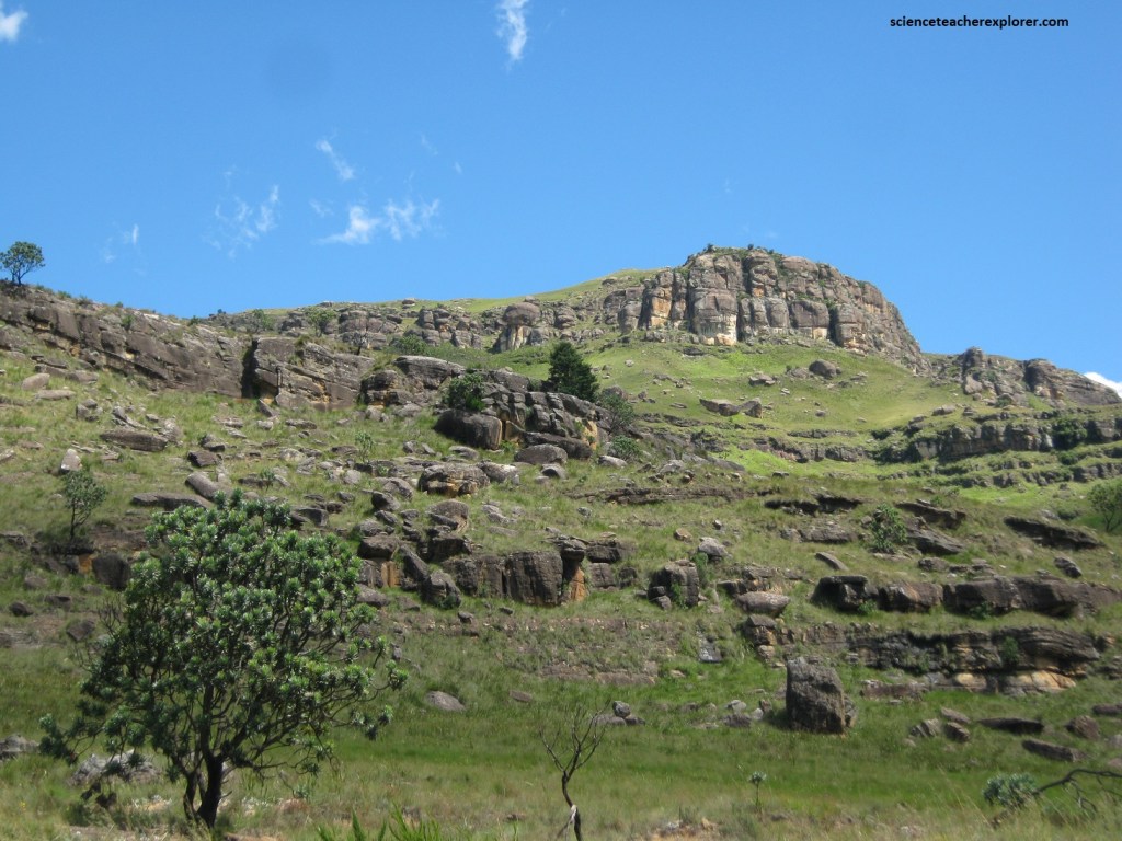 Pictured above, the top of Wonderkopp in the Golden Gate has the Drakensberg Group that is up to 600m of dark grey, amygdaloidal basalt lava flows that make up the high ground and peaks, and have produced blackish soil covered by tough mountain grass.