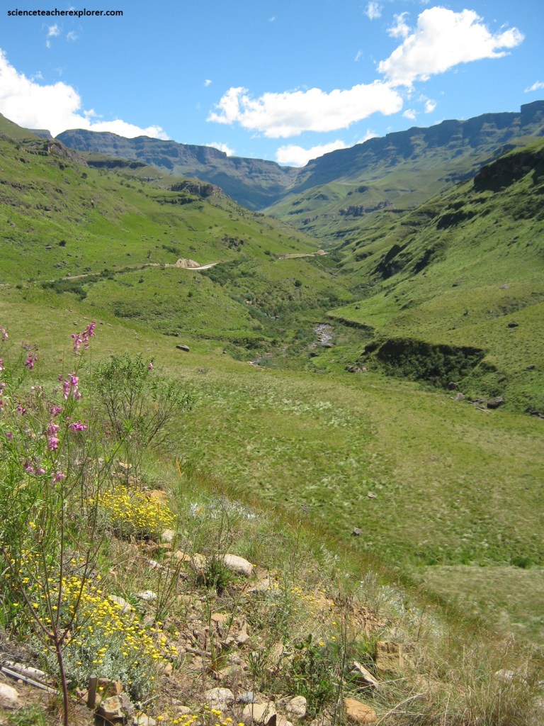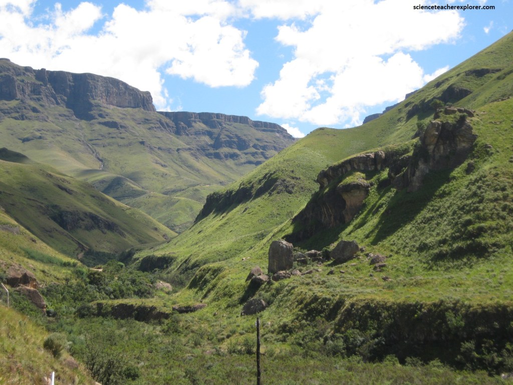 Pictured above, the Sani Pass lies at the head of the strongly incised Mkhomazona River Valley, which has cut back deeply into the Drakensberg Escarpment.