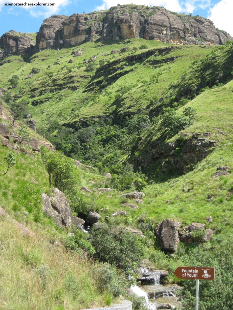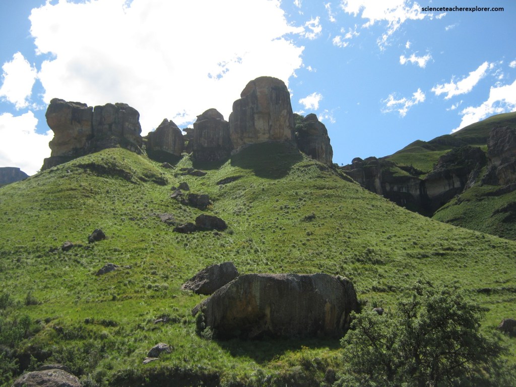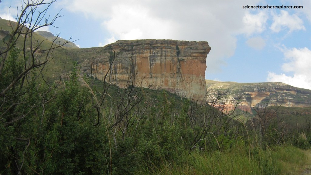 Encircling the mountain is a thick scree slope formed by the accumulation of weathered and eroded rock debris over many millions of year. Pictured above, the Clarens Formation sandstone was o windblown (aeolian) origin and is well known for its overhanging caves, (like in the Golden Gate area).
