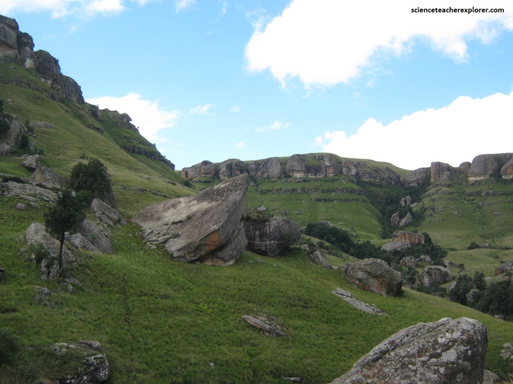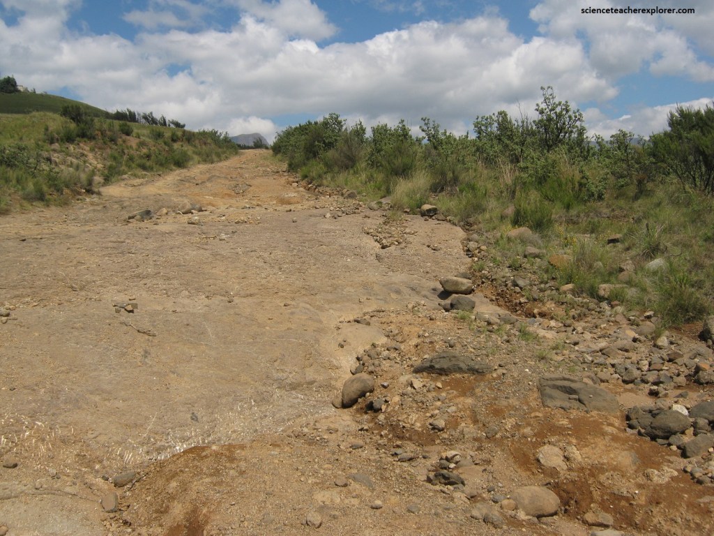 Pictured above, erosion is enhanced here by a dlerite dyke that runs northwestwards up the Mkhomazona River Valley and forms the neck at the top of the pass.