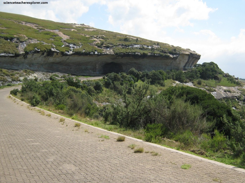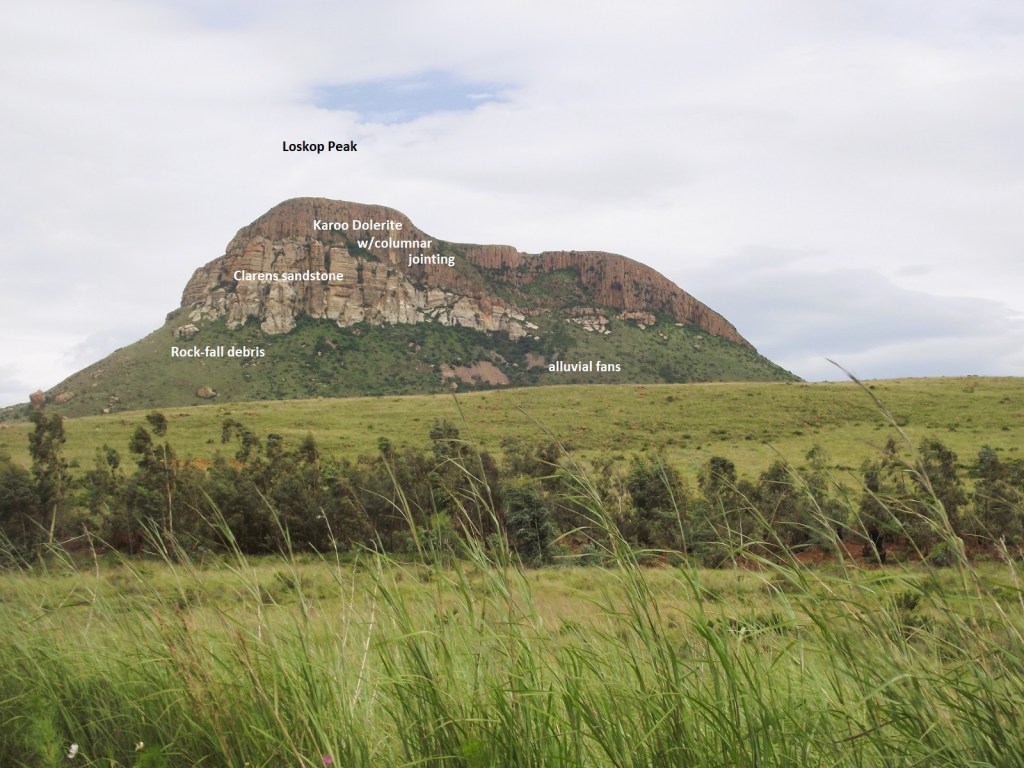 To the northeast of Platberg an isolated hill know as Loskop reveals the marked trasgressive nature of the sill cutting across beds of horizontal Clarens sandstone, providing good evidence of an intrusive origin for the dolerite, (pictured above). Alluvial fans made of collapsed rock debris are shown on the right.
