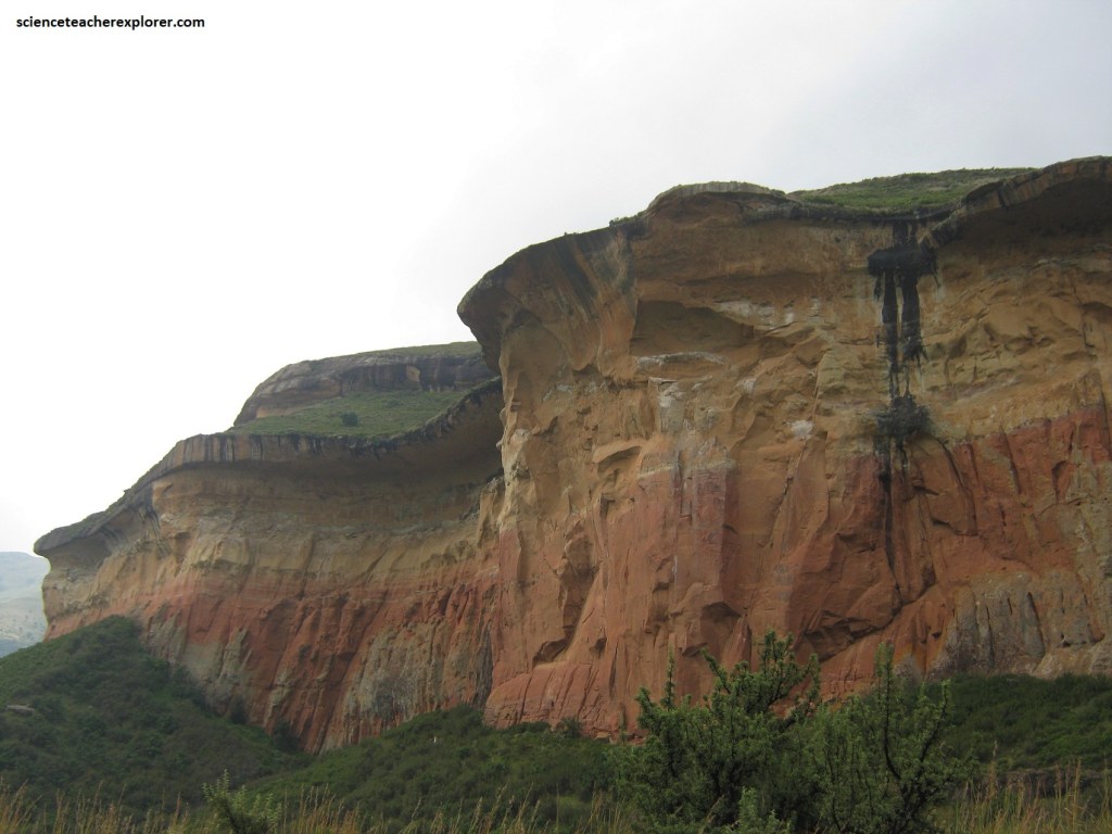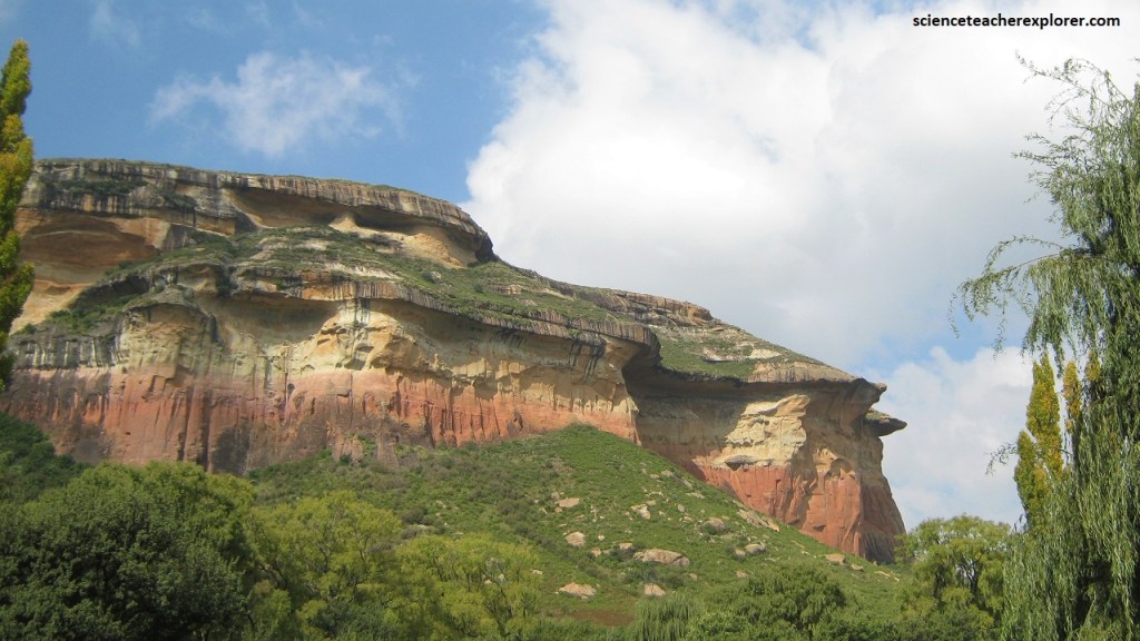 Pictured above, below the Clarens sandstone, the Elliot Formation is seen only in the ‘lower’ river valleys, (west of the park). It consists of flat-lying beds of red mudstone and siltstone, and lesser, fine-grained yellowish sandstone.
