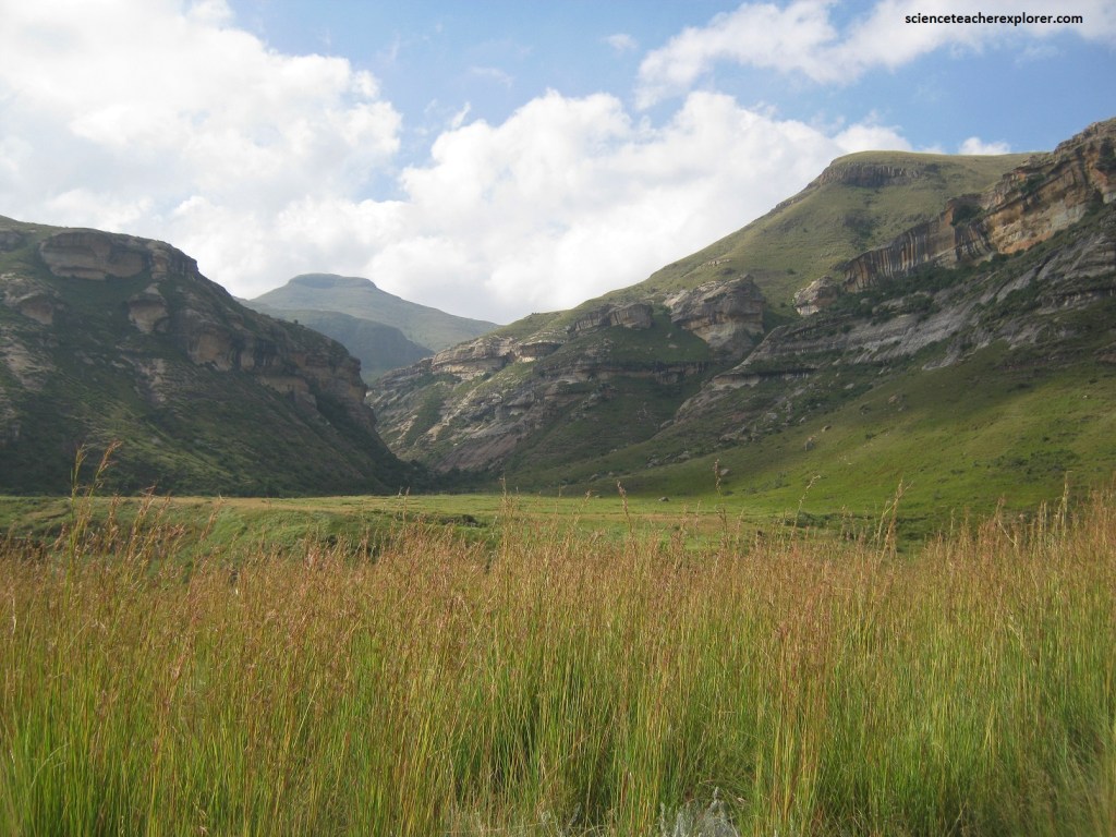 Pictured above, the formations in the Golden Gate National Park represent the uppermost part of the Karoo Supergroup and comprise, from top down, the Drakensberg Group and the upper part of the sedimentary Stormberg Group, which predates the Drakensberg lavas. There are also numerous Karoo dolerite intrusives around 183 million years in age. The terrain is predominantly steep, open montane grassland.