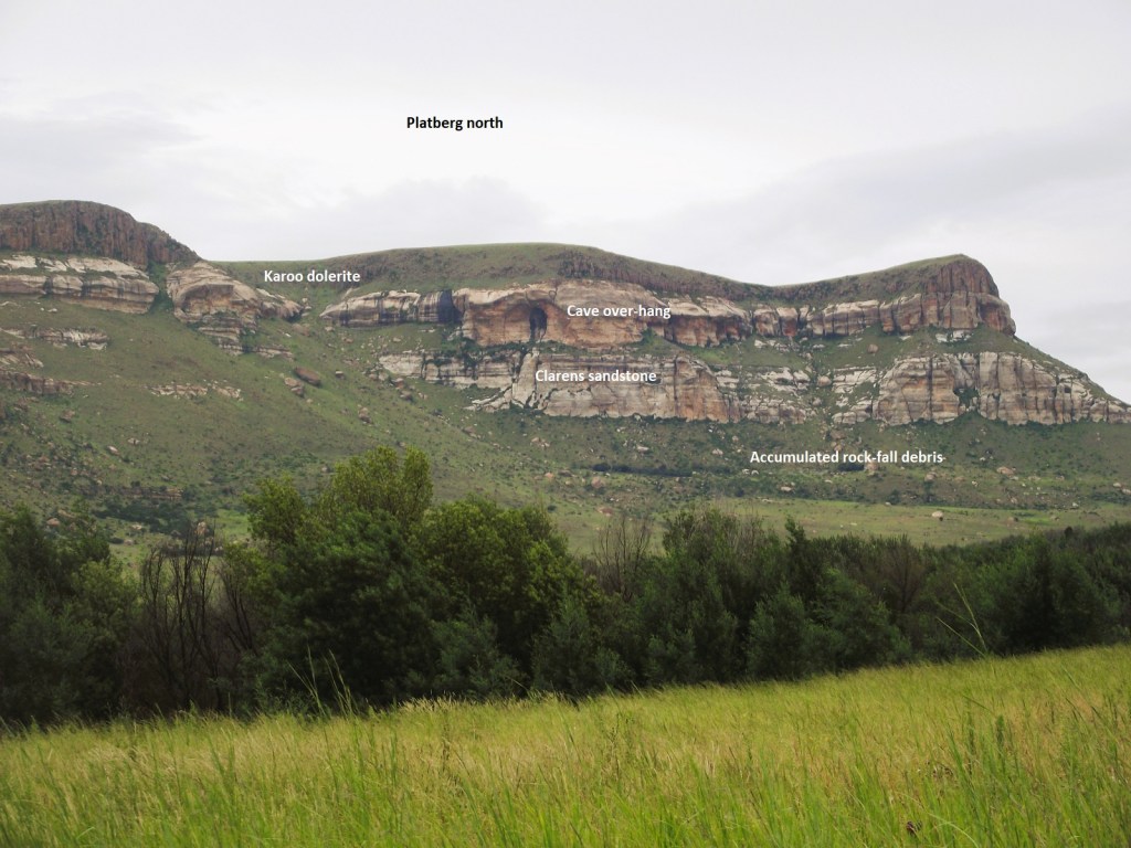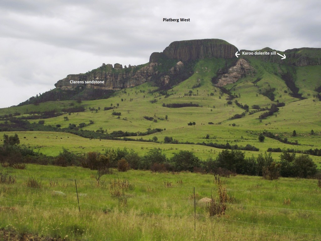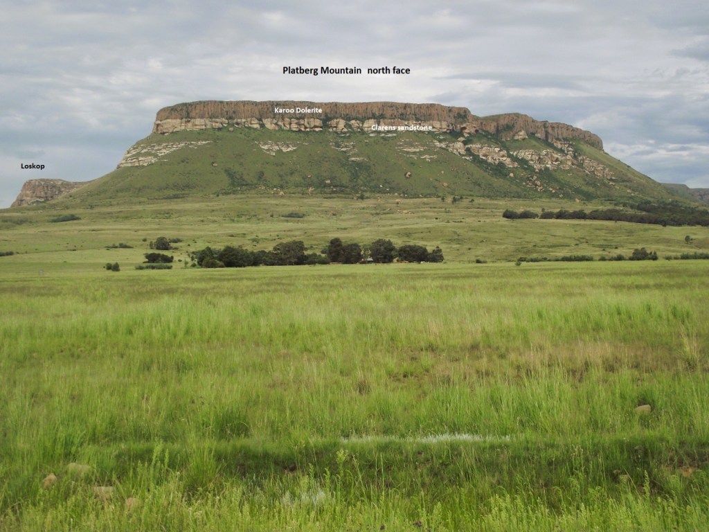 Pictured above, Platberg is positioned at the very top of the Karoo Supergroup. Here a flat-lying, sill-like body of Karoo dolerite overlies whitish sandstone of the Clarens Formation, which is some 190 million years old. Platberg is an inselberg, literally an ‘island mountain’.