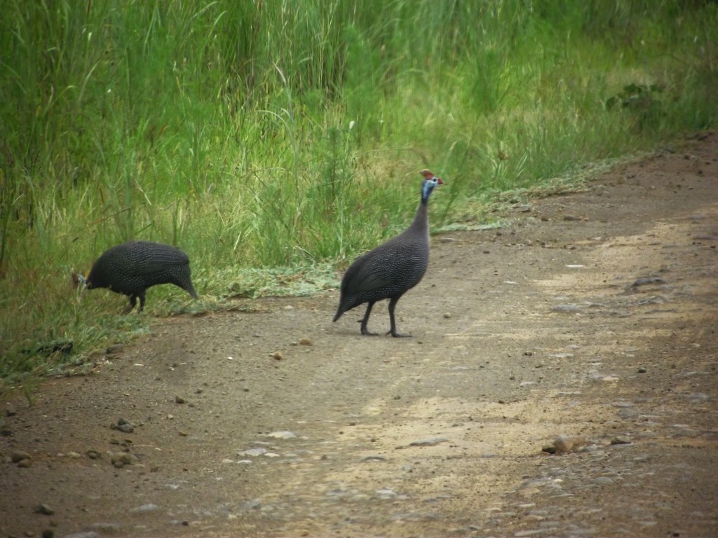 Picture below, is the Helmeted Guineafowl Numida meleagris. We saw it, while driving around the Platberg Mountain. The bare blue head, red crown and light brown casque is diagnostic. They usually forage in the open areas by scratching for food.