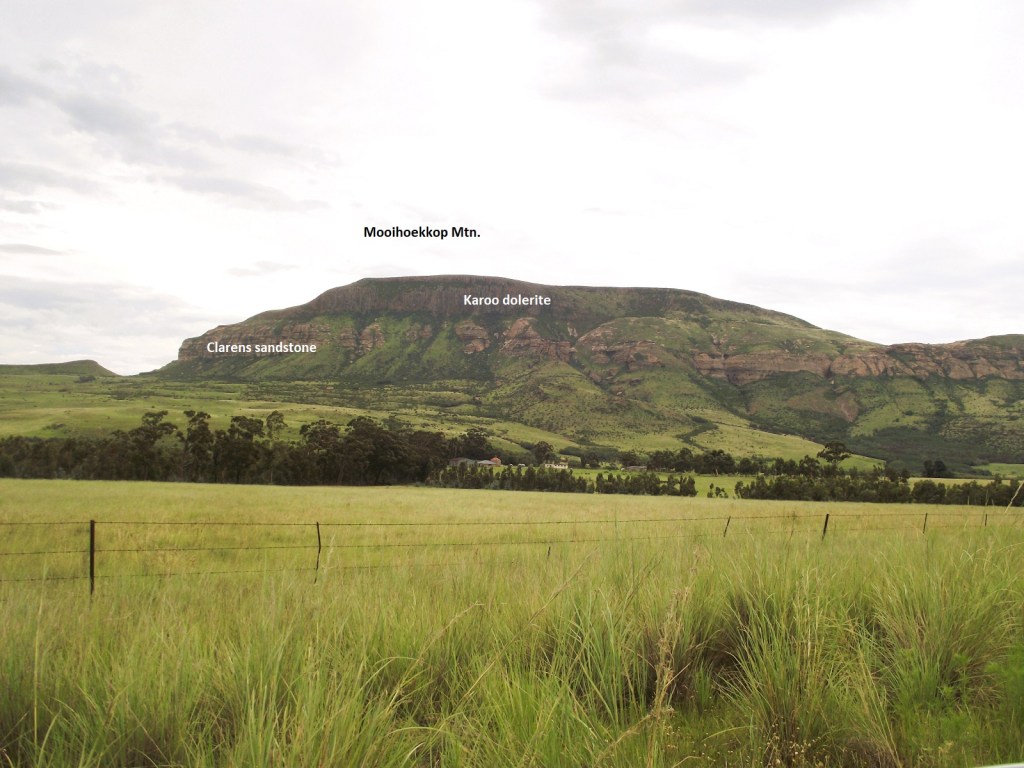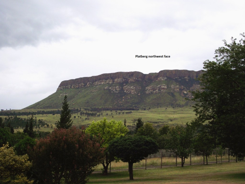 As mentioned, Platberg Mountain is capped by an outlier of Drakensberg basalt lava, as are the nearby smaller peaks of Mooihoekkop to the northeast and Loskop to the north. Platberg shows one of the most impressive occurrences of columnar jointing to be seen in South Aftrica.