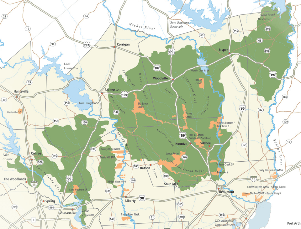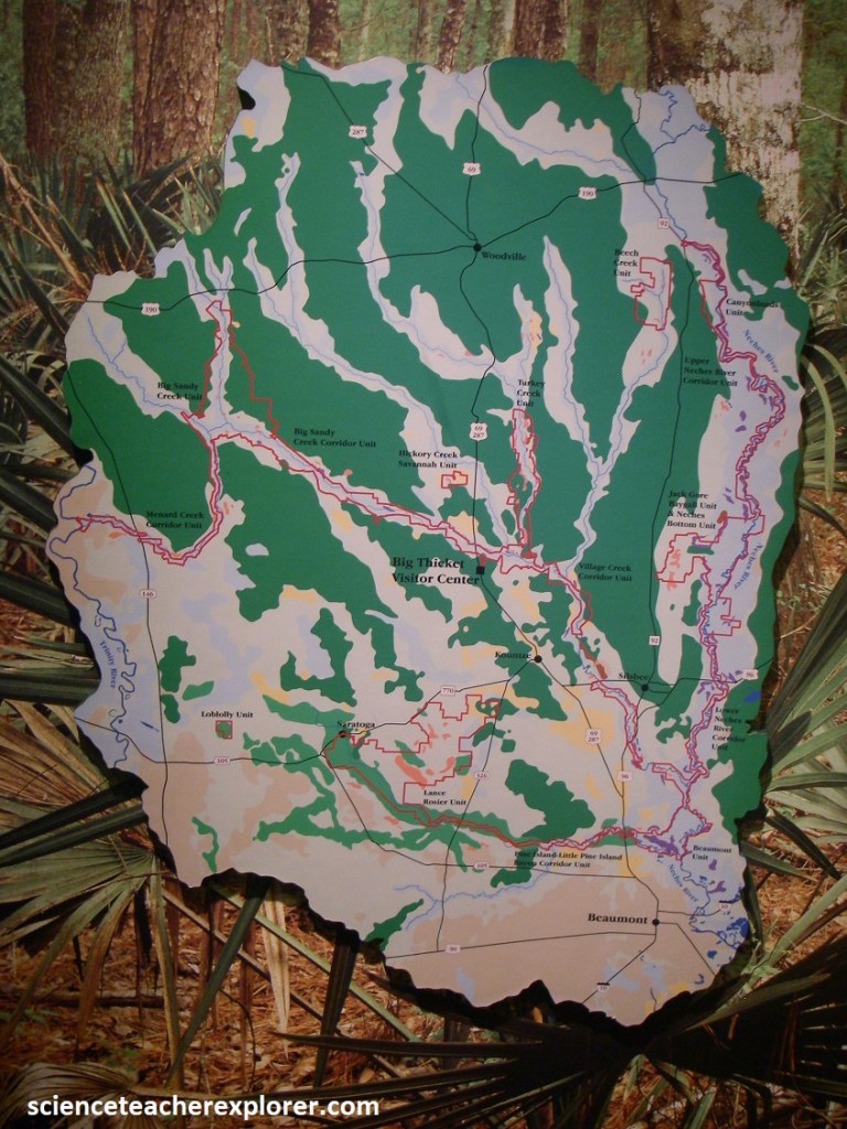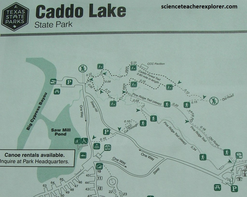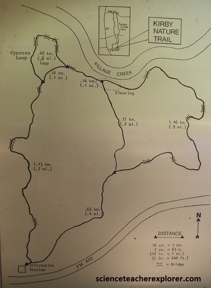 I first stopped at the main visitor center, sitting just east of TX-69 on TX-420. There, I got directions to trek the Kirby Nature Trail, (imaged below).