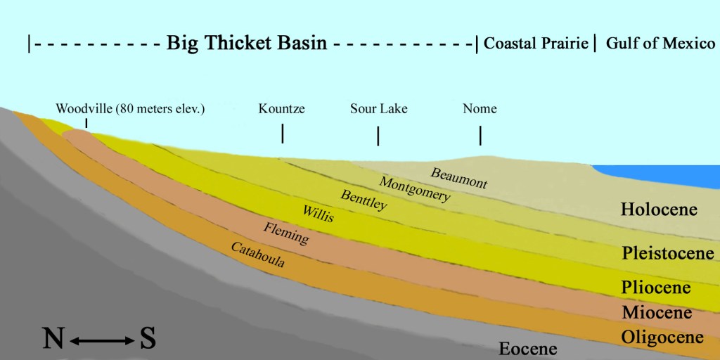 The Big Thicket is situated in the Coastal Plain physiographic province of southeast Texas, a region underlain by a thick accumulation of hydrocarbon-rich strata dating back to the Triassic Period approximately 250 million years ago. The geology of the Big Thicket is comprised of much younger, Cenozoic sedimentary strata, with the oldest bedrock consisting of the Miocene (23 to 5.3 million years ago) Fleming Formation that occurs in the upper reaches of the Neches River and Big Sandy Creek within the preserve.