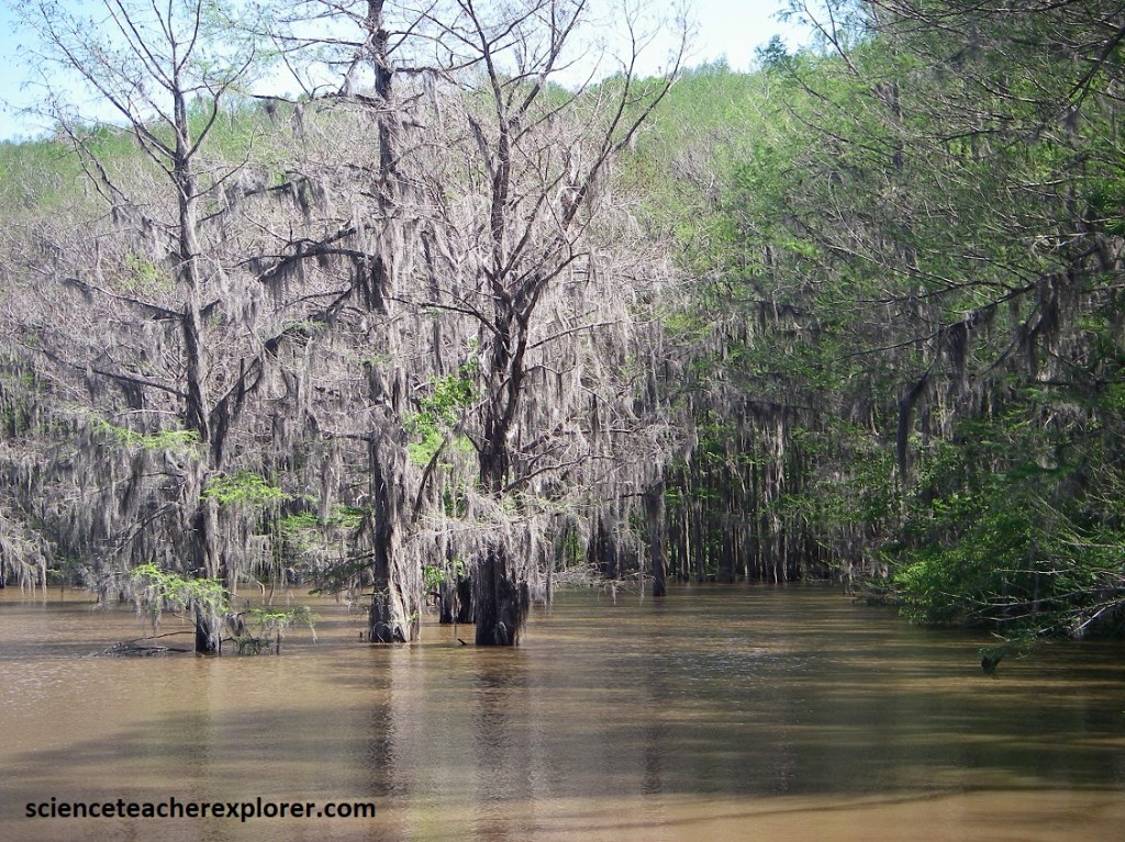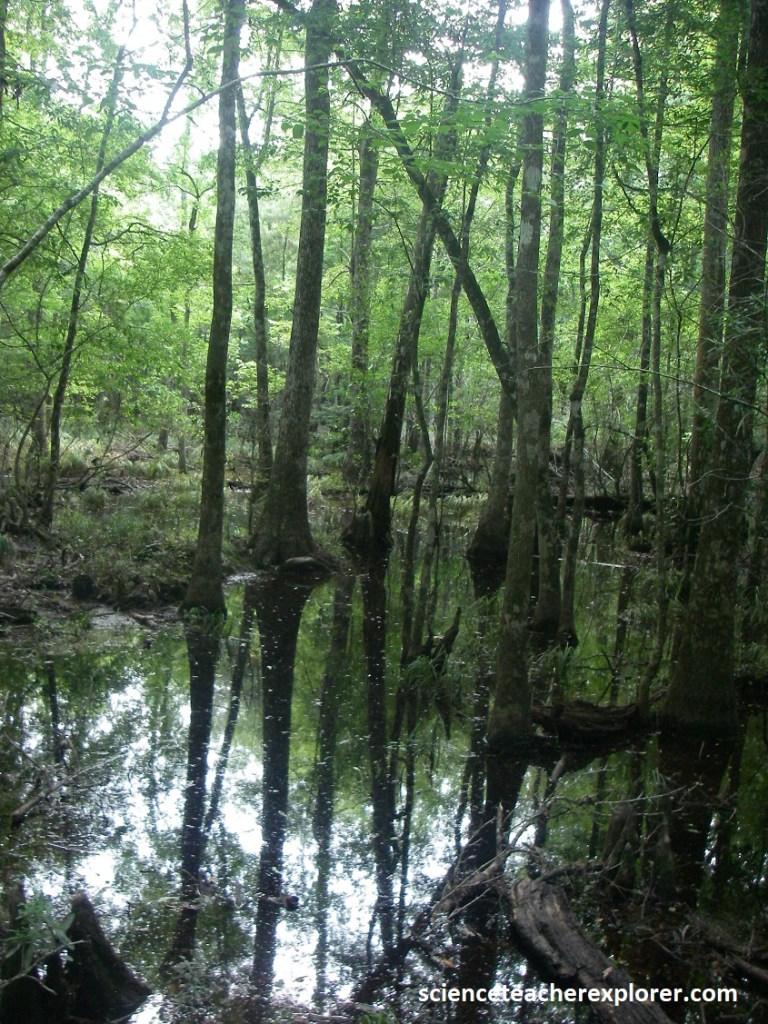 Pictured above, floods from the nearby streams and rivers turn this forest of cypress and tupelo trees into the perfect home for alligators and water moccasins. Regular flooding flushes away organic debris preventing cypress sloughs from becoming too acidic, like baygalls.