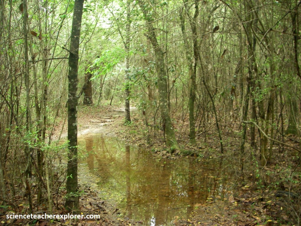 Kirby Trail is mostly a slope forest ecosystem. The slope forest is a mature, closed canopy forest of upland hardwoods on a geologic slope. This slope forest is home to many intermittent streams, cypress tupelo sloughs, and other natural drainages that provide pathways for both terrestrial and aquatic animals into this dense habitat, (pictured below).