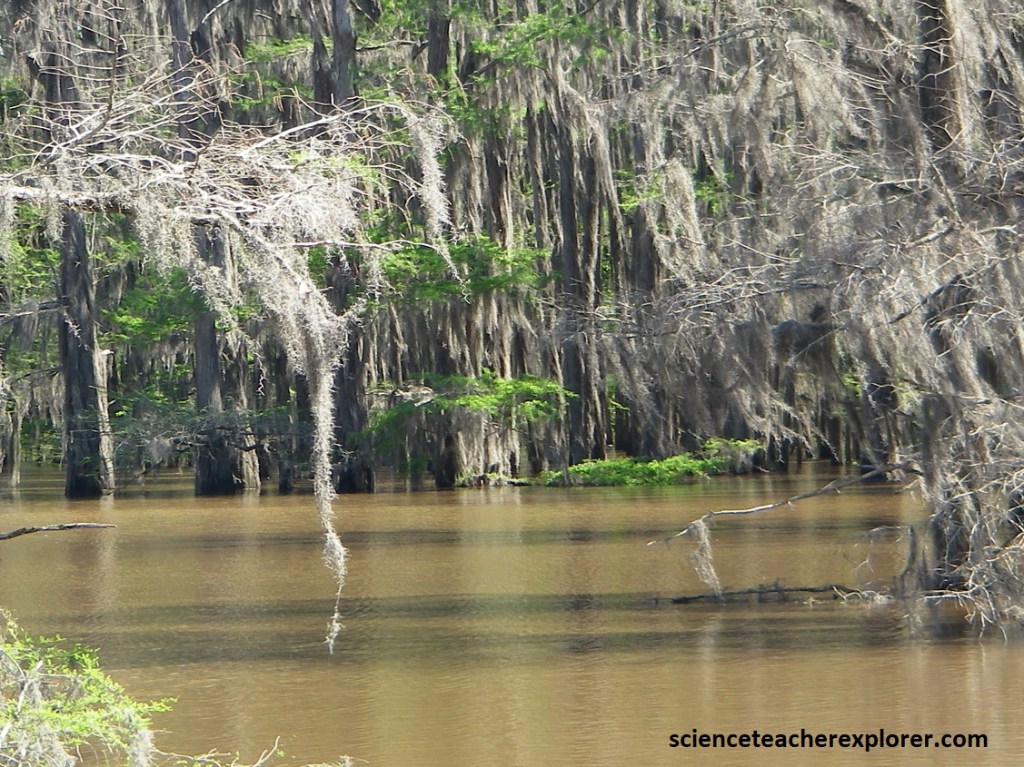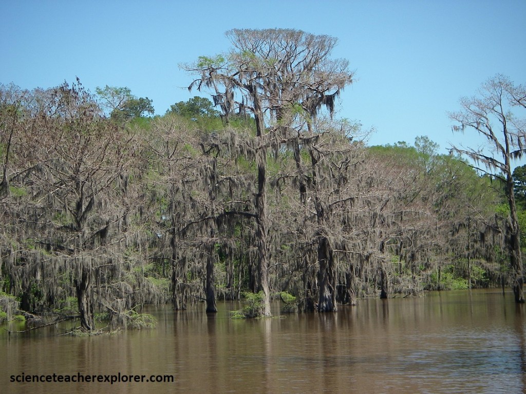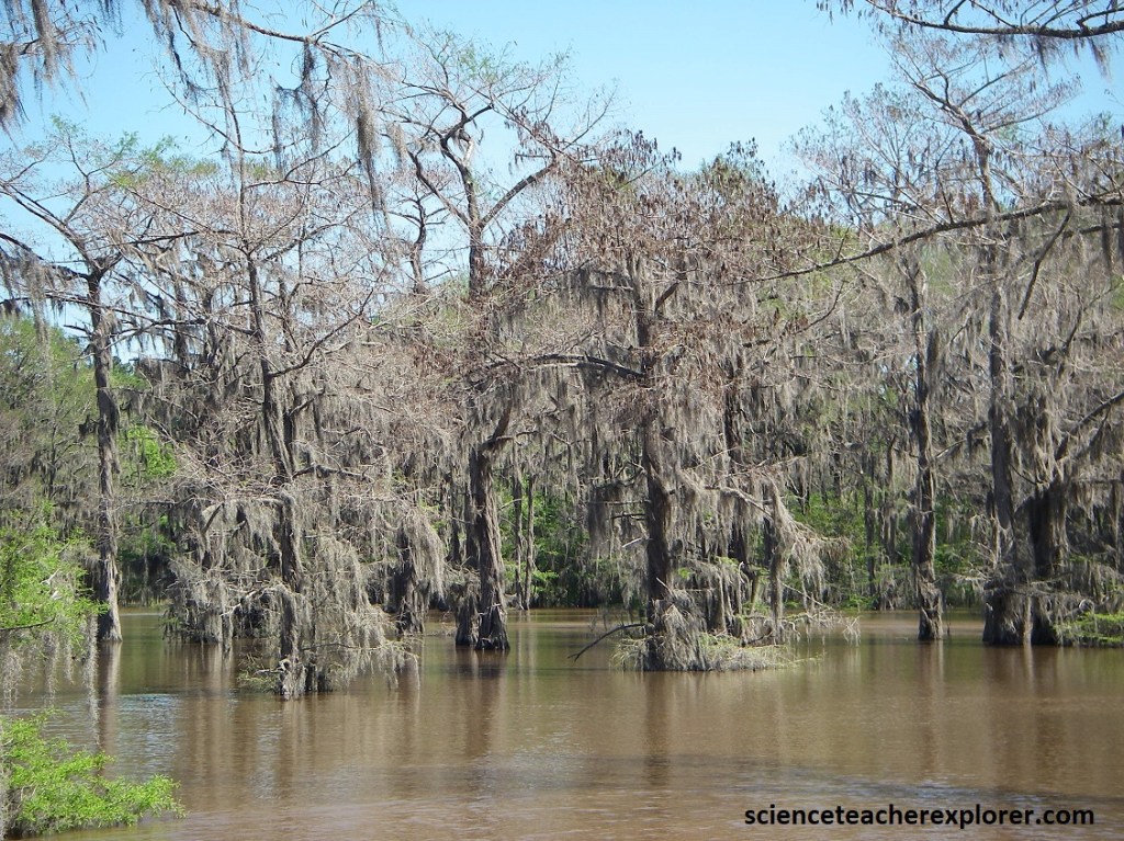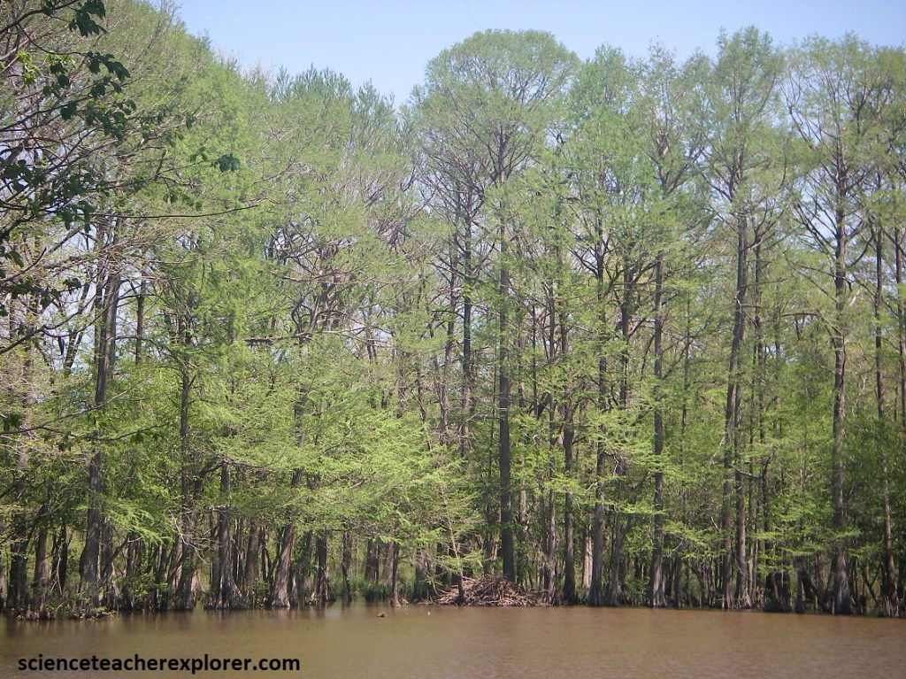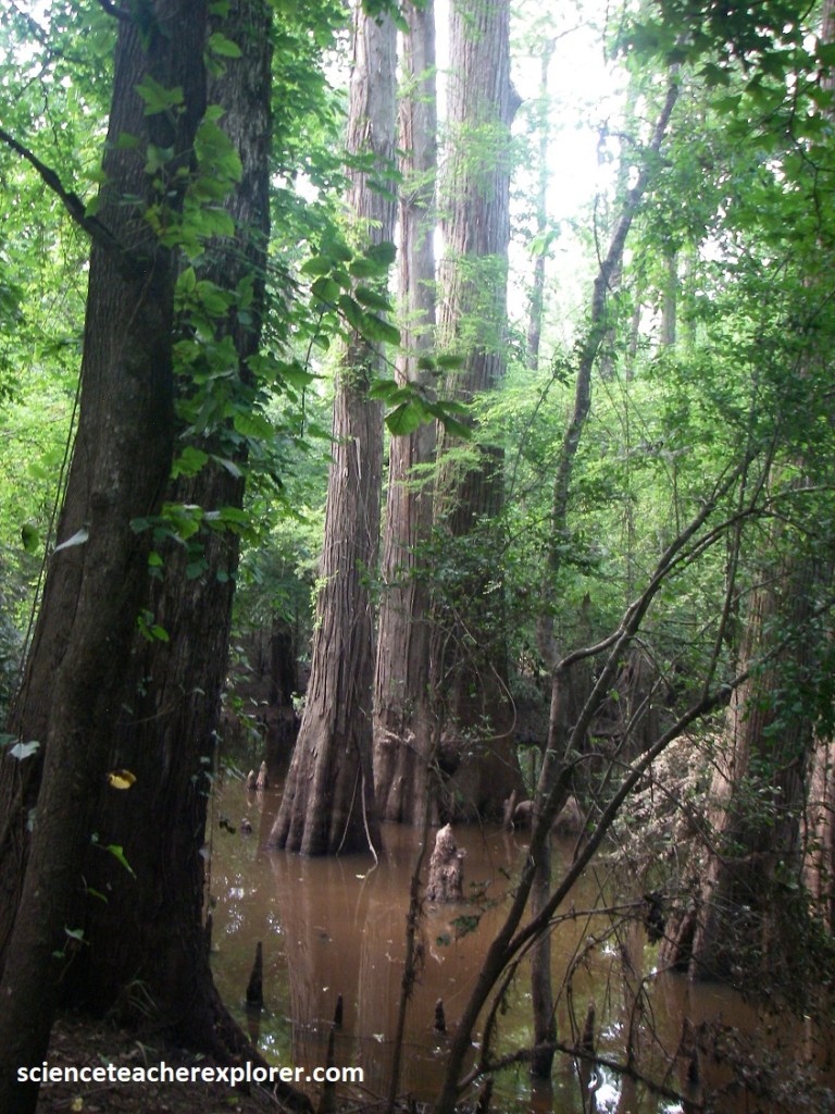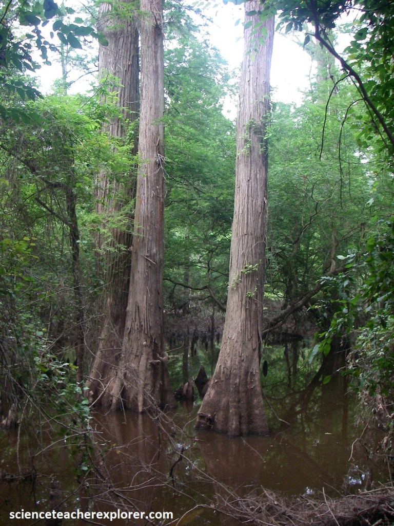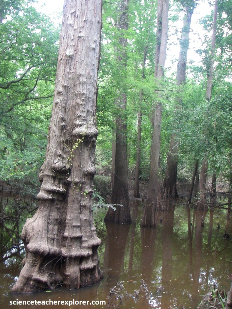 Pictured above, the thick-buttressed trunk of the black swamp tupelo keeps it from toppling over in the mushy soil, while the bald cypress is kept upright by the knobs, or “knees”, around it. The “knees” may also transfer oxygen to the tree’s submerged roots.