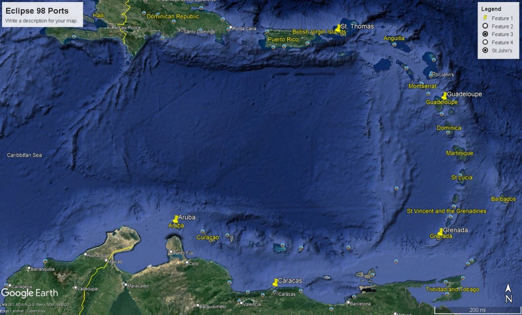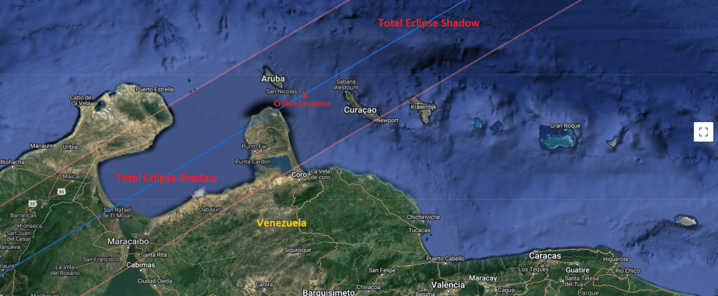 Our Captain of the cruise-ship chose the 18:12 GMT center line position. He planned to rendezvous with the Moon’s shadow at a Latitude of 12 degrees 17.5 minutes North and Longitude of 69 degrees 43.0 minutes West.