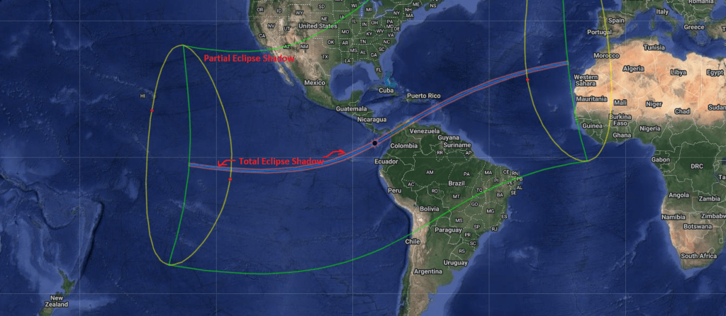 The next day of our cruise was Eclipse day, February 26th. The image above shows the shadow zone across the earth. It is important to note: There are four main phases of a Total Solar Eclipse: