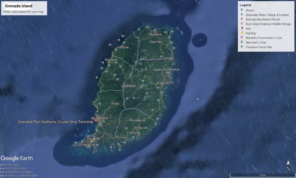 Imaged above, our next Port-of-call was the island of Grenada. Grenada is its own island country in the West Indies of the Caribbean Sea at the southern end of the Grenadines island chain. Grenada is the southernmost island in the Antilles archipelago, bordering the eastern Caribbean Sea and western Atlantic Ocean.