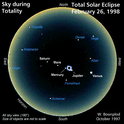 During the totality of the eclipse, the corona was a classic solar minimum or elliptically shaped corona. The western equatorial extension of the corona was broader and brighter. Near the north edge of the Sun’s disk and close to the point of second contact, a magnificent red prominence was visible, even to the naked eye. Surrounding the Sun were two brilliant planets: Mercury 4 degrees to the northeast and Jupiter almost 3 degrees to the southwest.
