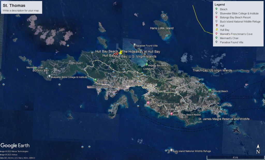 Pictured above, when we debarked off of the ship in Charlotte Amalie of St. Thomas, we immediately approached a vendor to take us up to the top of the hill at a view-point and down the other-side, (northside), to Hull Bay. Since 1998, we’ve visited St. Thomas many times. In fact, we’ve even stayed at the Blue Beard’s Castle Resort for an entire week in 2010.
