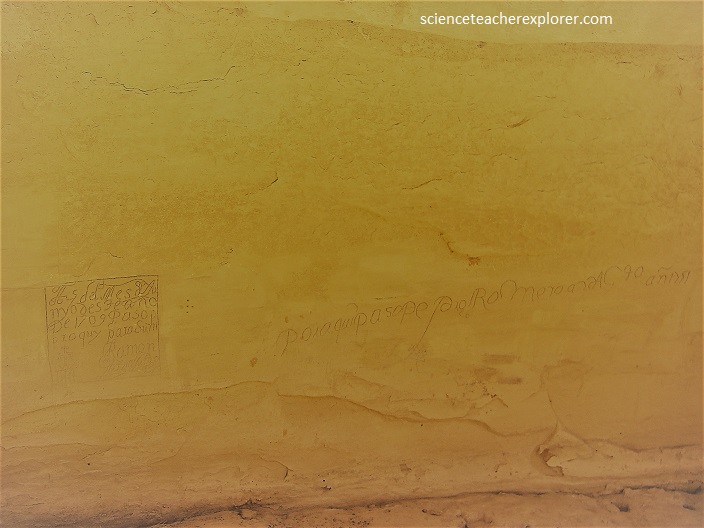 With its oasis-like source of water, El Morro served as a stopping place for numerous travelers through the otherwise arid and desolate region, many of whom left signatures, names, dates, and stories of their treks in the walls of the sandstone cliff. While some of the inscriptions are fading, there are still many that can be seen today, with some dating to the 17th century. Pictured below, I’ve used a filter to enable some of the inscriptions to be seen.