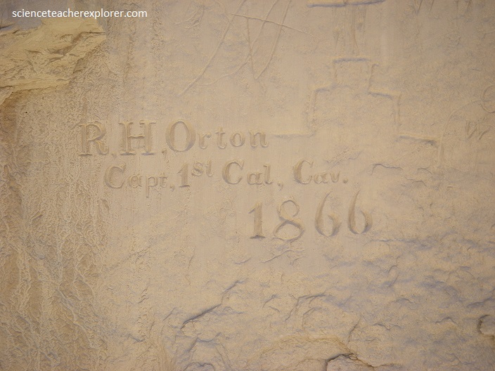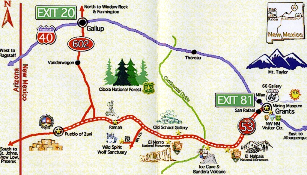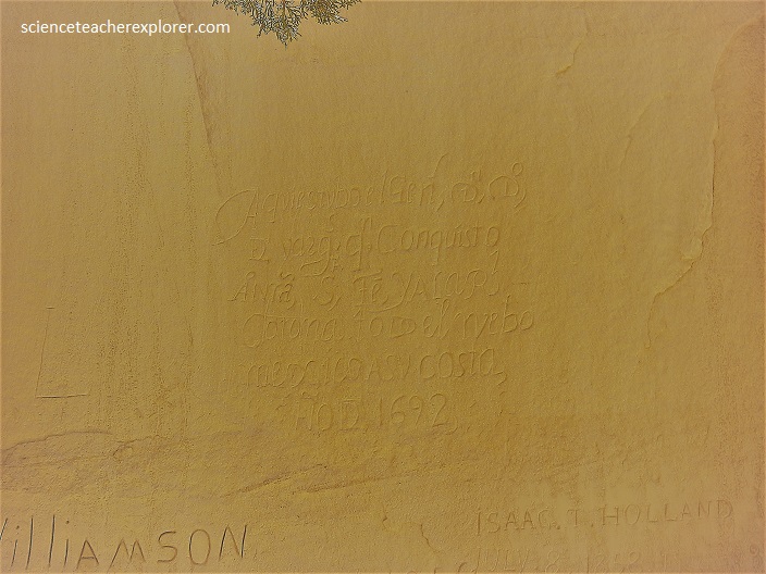Pictured above, travelers, including Native Americans, Spaniards, and citizens of the United States, have carved their symbols, names, messages, and dates of their passage into the soft cross-bedded Zuni Sandstone for centuries. Located on an ancient east–west trail in the western part of the state, the monument preserves the remains of a large prehistoric pueblo atop a Zuni Sandstone Promontory with a pool of water at its base, which subsequently became a landmark where many centuries of explorers and travelers left historic inscriptions that survive today.