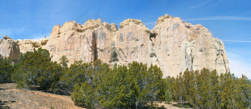 El Morro, which means “bluff” or “headland” in Spanish, is an imposing cliff made of Middle to Late Jurassic (155 to 165 million years old) Zuni Sandstone capped by Late Cretaceous Dakota (~95 to 96 million years old) sandstone and shale.
