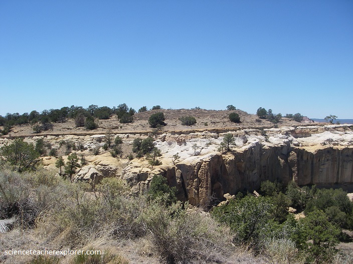 Pictured above, the sandstone beneath the Dakota Sandstone is bleached to white several feet below the contact. This represents a time gap on the order of 60 million years and the bleached horizon is a paleo-weathering surface. In places, pieces of the underlying Zuni Sandstone have been incorporated into overlying sandy to gravelly stream deposits within this bleached layer.