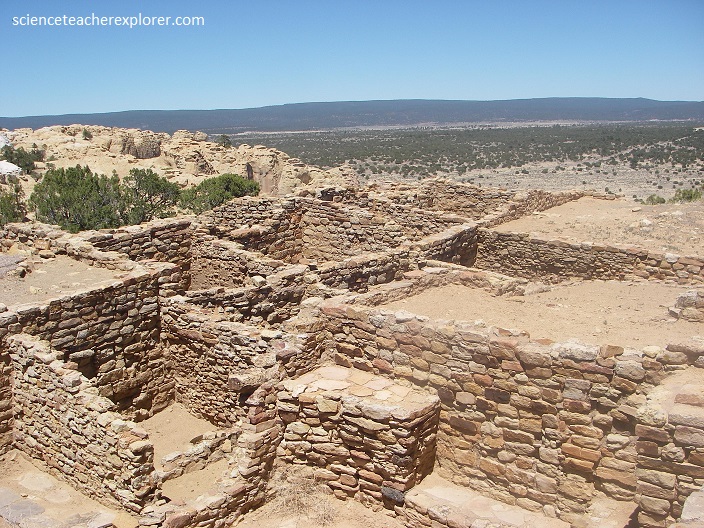 Pictured above, between about 1275 to 1350 AD, up to 1,500 people of the Ancestral Puebloan culture lived in the 875-room mesa-top pueblo. The village was situated on the old Zuni-Acoma Trail, an important prehistoric trade route. Spanish explorers visiting the area in the 16th century referred to the notable promontory as El Morro (“The Headland”); the local Zuni Indians call it A’ts’ina (“Place of writings on the rock”), and early Anglo-Americans called it Inscription Rock.