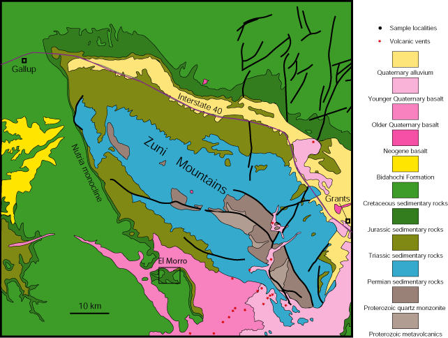 El Morro is on the southwestern flank of the Zuni Mountains, a subdued Proterozoic-cored uplift that formed during Laramide compressional deformation about 75 to 50 million years ago along the southern margin of the Colorado Plateau. The main thrust fault associated with formation of the Zuni Mountains is along the southwestern margin. The Proterozoic basement was shoved toward the southwest along the fault. The rocks within the monument dip gently (3°) toward the southwest away from the Zuni Mountains