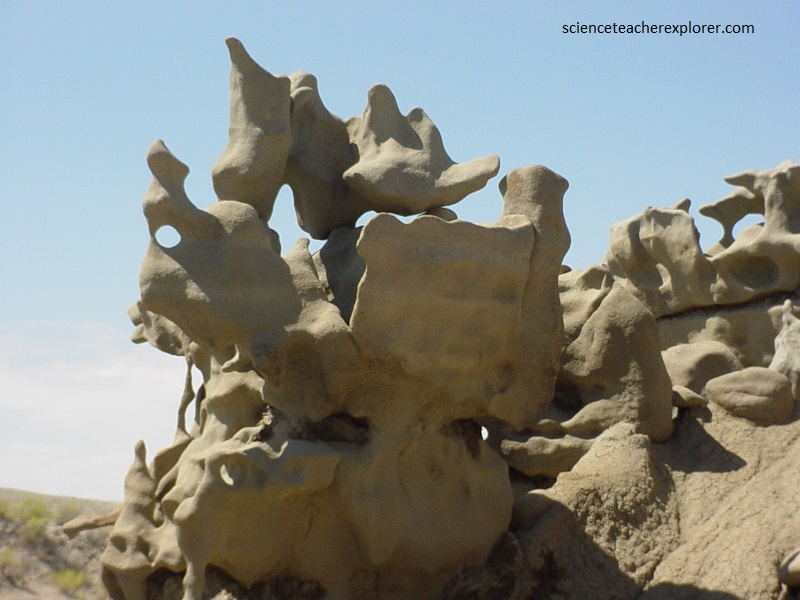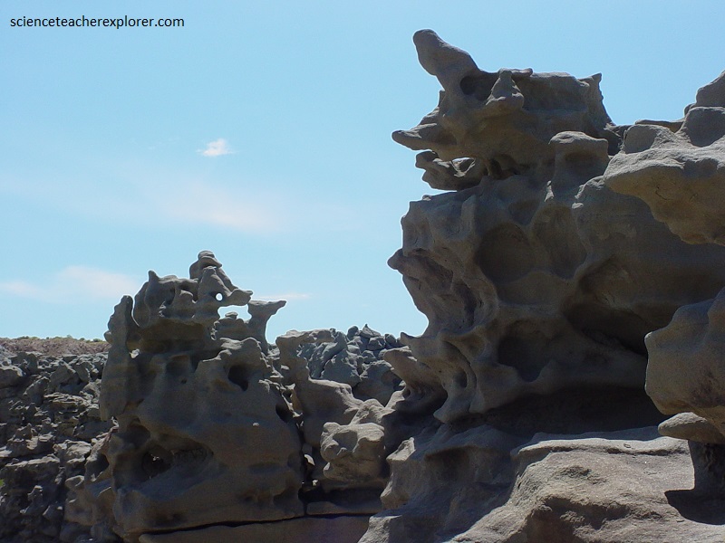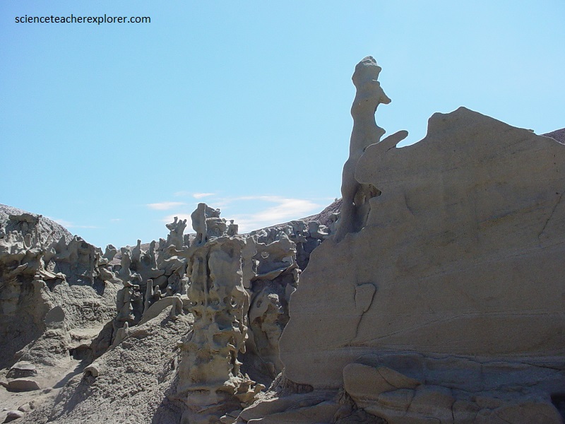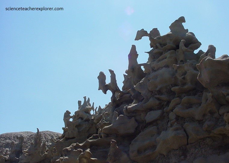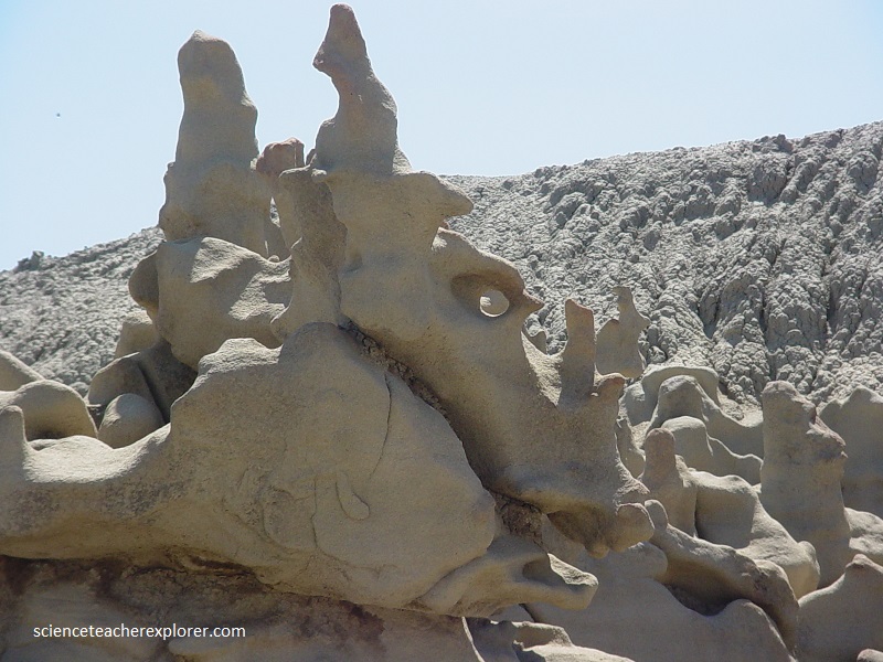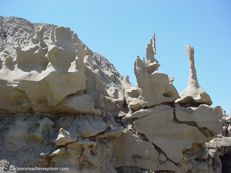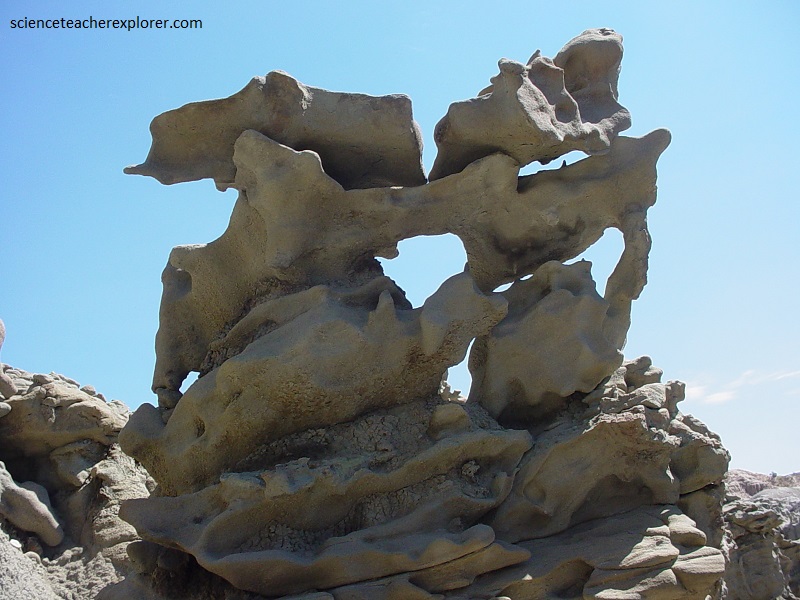 Pictured above and below, the mudstone and claystone have been stripped away by water and wind, leaving the slightly more durable sandstone to be carved into bizarre, melted wax-like forms.