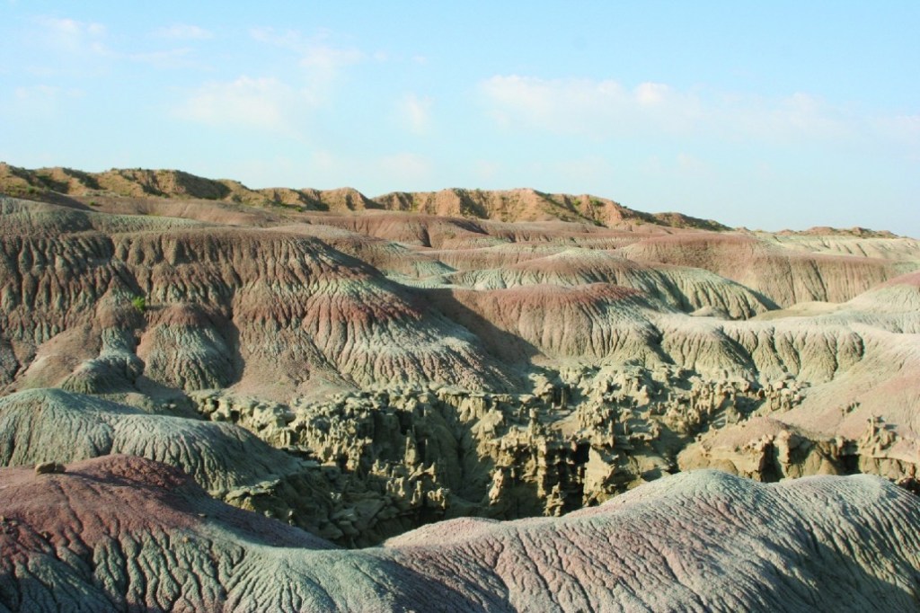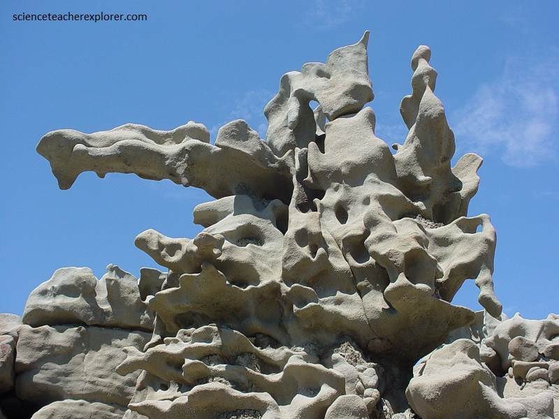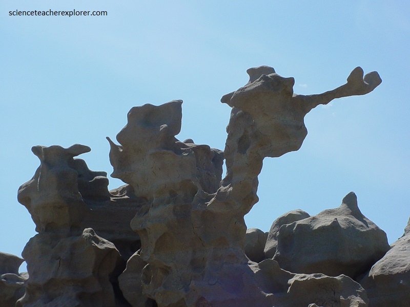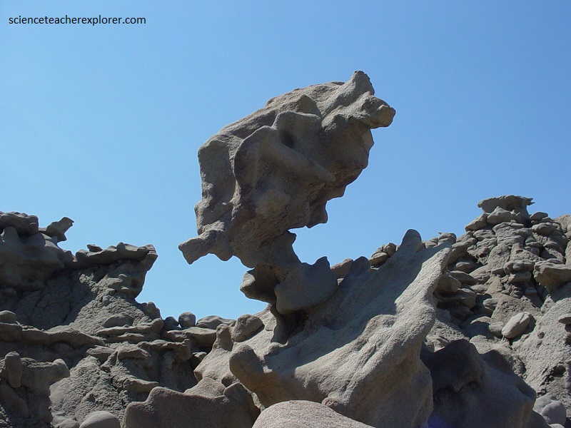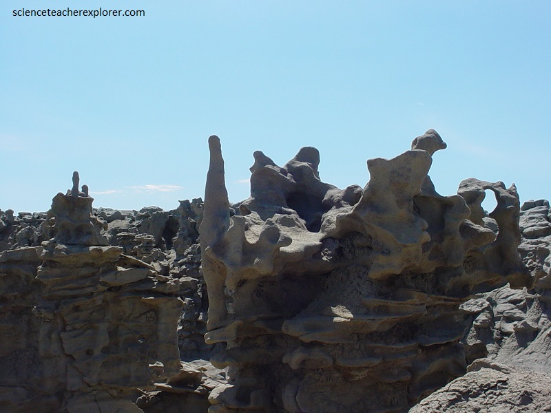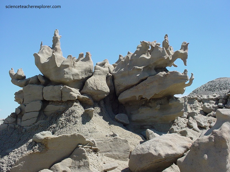 Pictured above and below, the mudstone and claystone have been stripped away by water and wind, leaving the slightly more durable sandstone to be carved into bizarre, melted wax-like forms.