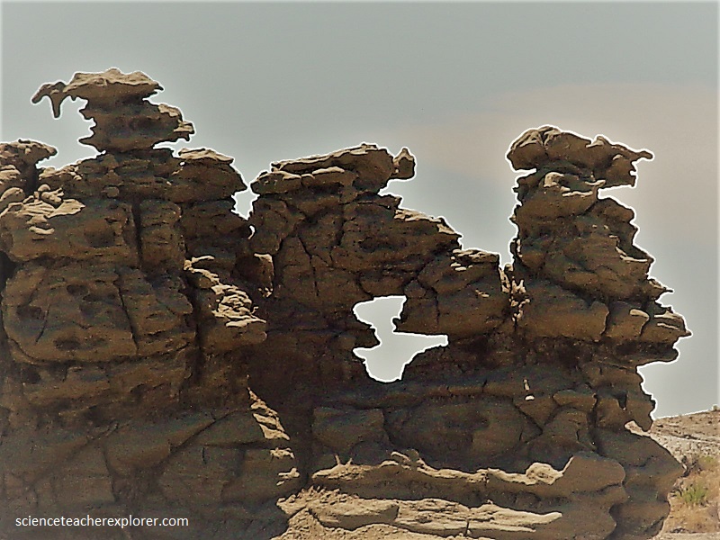 The stunning pinnacles, pillars, arches, and knobs that form Fantasy Canyon are formed from the sandstone layer formed from ancient river channel sediment deposits, (pictured below).