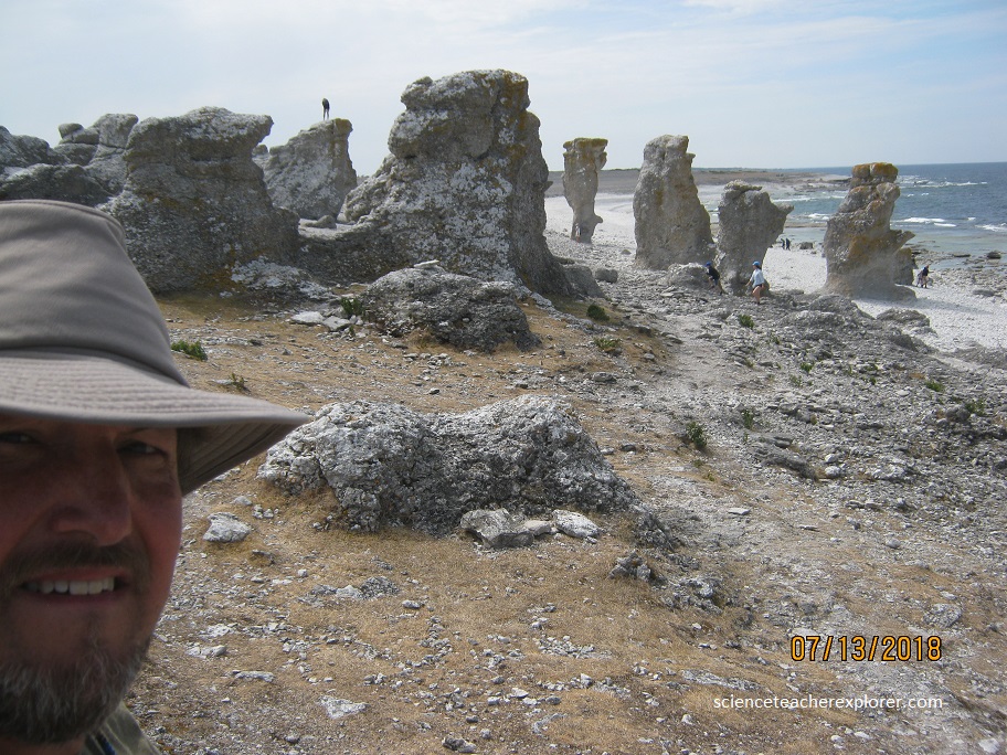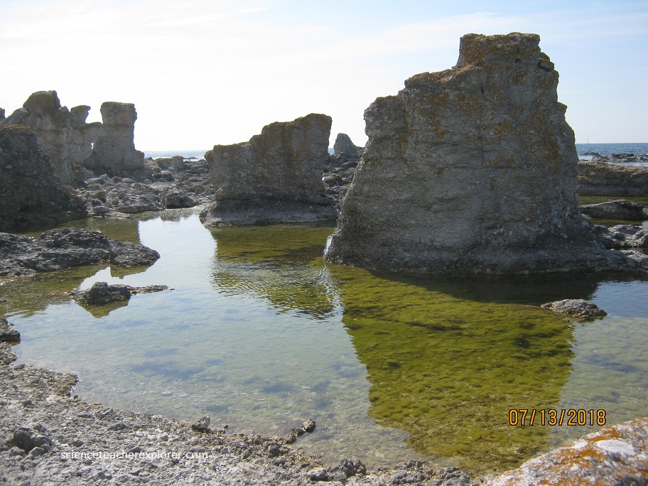 Mikael Calner, professor and head of the Department of Geology at Lund University says that the raukarna on Faro Island are “erosional remnants that have been carved and sculpted during the latest glacial period and sea-level lowering.” Sea level has gone up and down several times in the Baltic during the past 15,000 to 20,000 years, and the last glaciers retreated about 12,000 years ago. Calner says that “the parts left as sea stacks are the cores of the reefs that grew in the Silurian”, about 443 million to 416 million years ago.