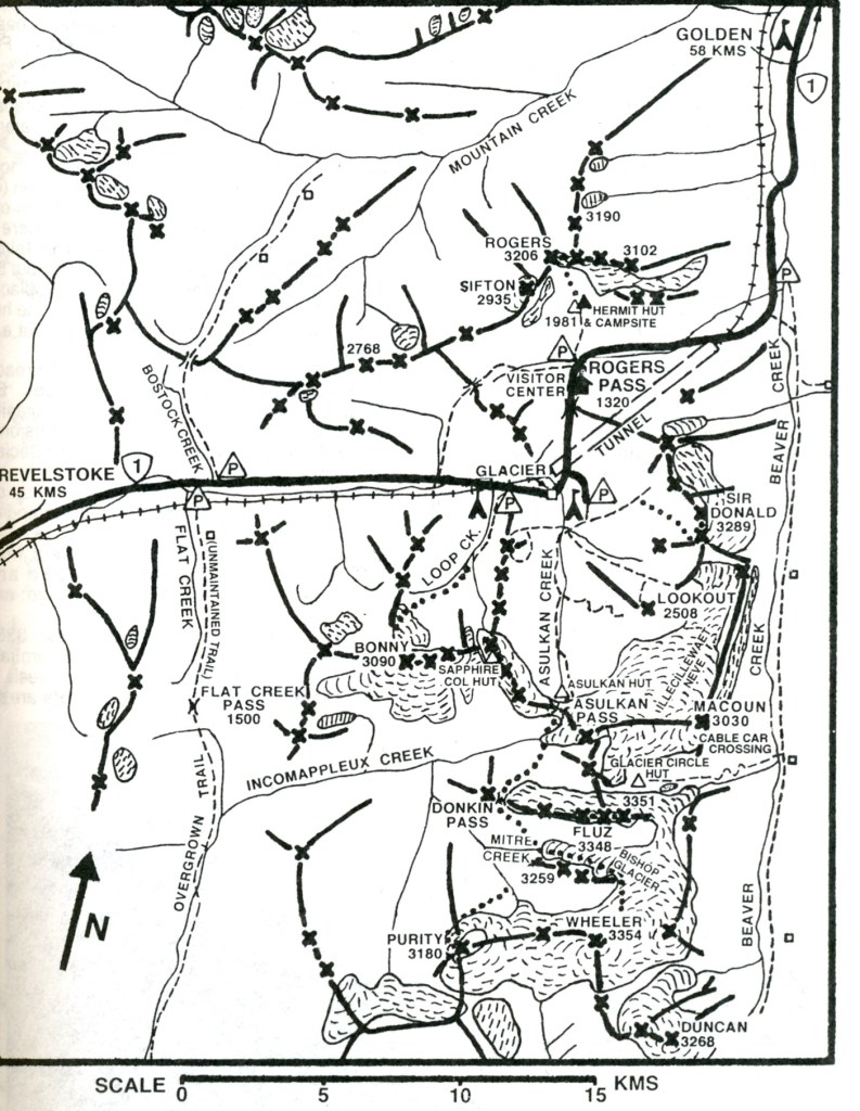 Glacier National Park lies in eastern British Columbia with its center near Glacier station on the Canadian Pacific Railway at 1170 30′ longitude and 51016′ latitude. The Trans-Canada Highway enters he northeastern corner of the park by crossing a line surveyed more or less directly across the Beaver River valley. Form the eastern end of this surveyed line the boundary trends irregularly southeastward along the divide between Beaver river (in the park) and various small tributaries of Columbia River to the east. In all, Glacier National Park comprises some 1000 square kilometers, much of it consisting of superb mountain scenery.