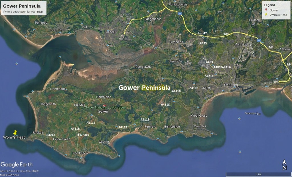 Our next and last destination geo-site was the Gower Peninsula & Worm’s Head. Driving to Worm’s Head in Rhossili, Gower, we took the M4 to Junction 47 (Penllergaer). We then turned south on A483 to junction A483/A4216 and turned right. We followed A4216 (Station Road) to the A4216/Vivien Road Junction and turned onto Vivien Road through Sketty, until Gower Road (A4118). We turned right (east) again and drove all the way to Scurlage at the A4118/B4247 intersection. By turning right onto the B4247, it led us directly to the National Trust car park at Rhossili, (closest to Worm’s Head).