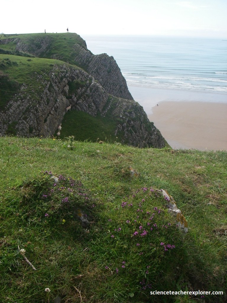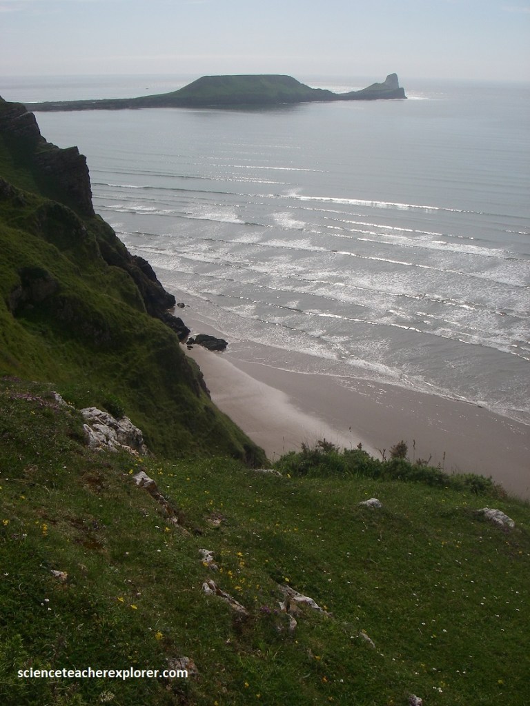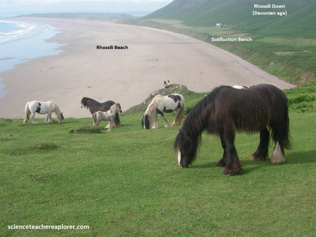 Pictured above, a solifluction bench is seen above the Rhossili Beach, (formed by the sludging of large quantities of surface material down the scarp at the end of the Ice Age). This formed an apron, which the sea has now truncated at the head of the beach, where there is a low cliff of loose material from the Rhossili Down.