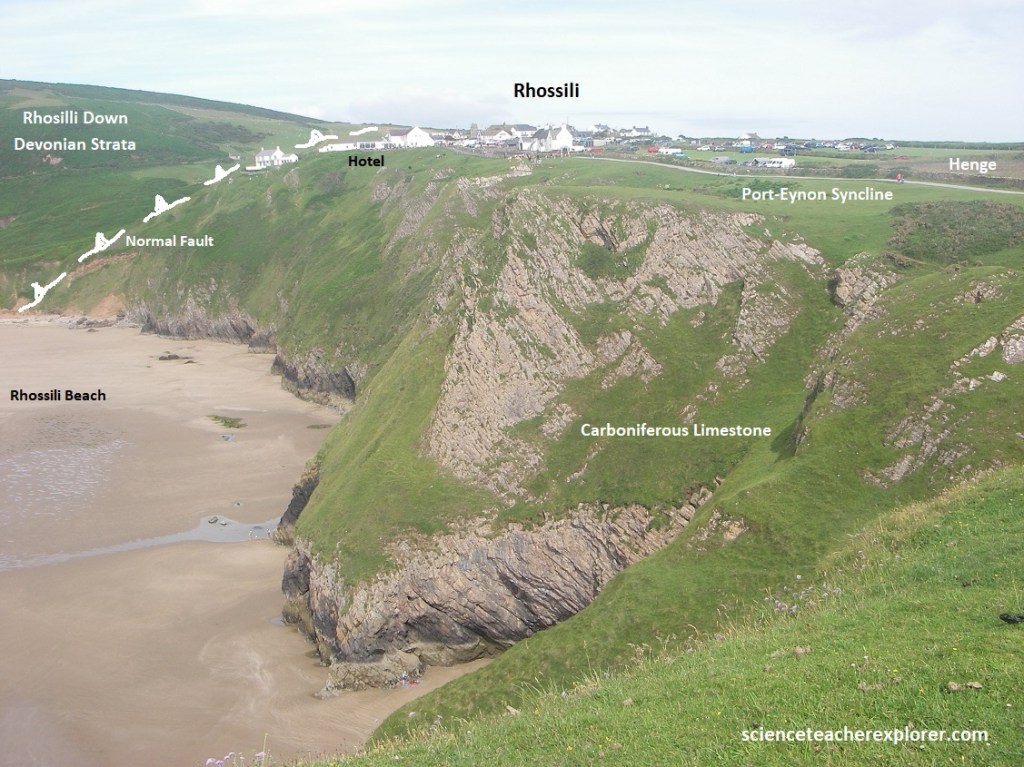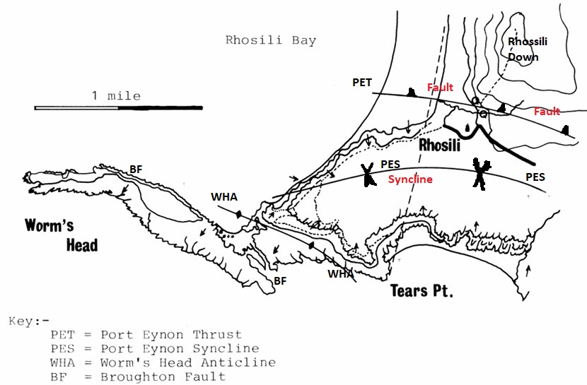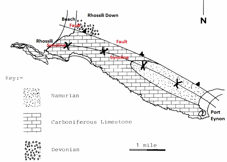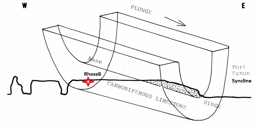 Pictured above, the strata in the Carboniferous Limestone is obvious. However, the dip indicates that a syncline passes somewhere to the south of the settlement of Rhossili, or possibly, underneath. According the image below, it is called the Port-Eynon Syncline.