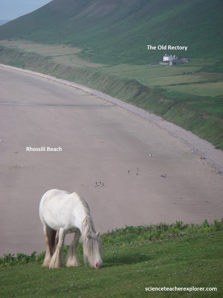 The Gower Peninsula, a designated Area of outstanding Natural Beauty, pushes out into the Bristol Channel between the estuaries of the River Loughor and Tawe. Pictured above, the Rhossili Down (often referred to in the context of the Gower Peninsula) is a prominent, high-elevation ridge located at the western tip of the Gower Peninsula. It is primarily composed of resistant Devonian-aged Old Red Sandstone, specifically quartz conglomerate and sandstone, which forms a prominent ridge rising above the coast. {Note: The pony’s seen above are considered semi-feral or wild. They are sometimes referred to as hardy Gypsy Cobs that can live outside year-round}.