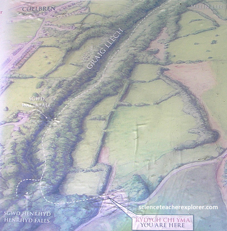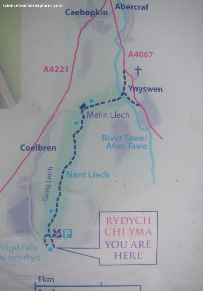 Our next geo-site destination, the Henrhyd Falls, was found southwest of the Cefn Cwm-Llwch trailhead. We approached it from Highway M4 via A470 north. We left, A470 at Abercynon and join the A4059 to Aberdare. At the far end of Aberdare, the A4059 became A465. We continued on the A465 to Glynneath. There we changed roads and headed through the town on the A4109. We stayed on A4109 to Banwen Pyrddin, where the road became A4221. After a few minutes, we took a right off the A4221 to Coelbren. There we headed down Dol Henrhyd Road until we turned left and crossed the river. After heading straight for a moment, we saw the Henrhyd Falls car park on our left-hand side.