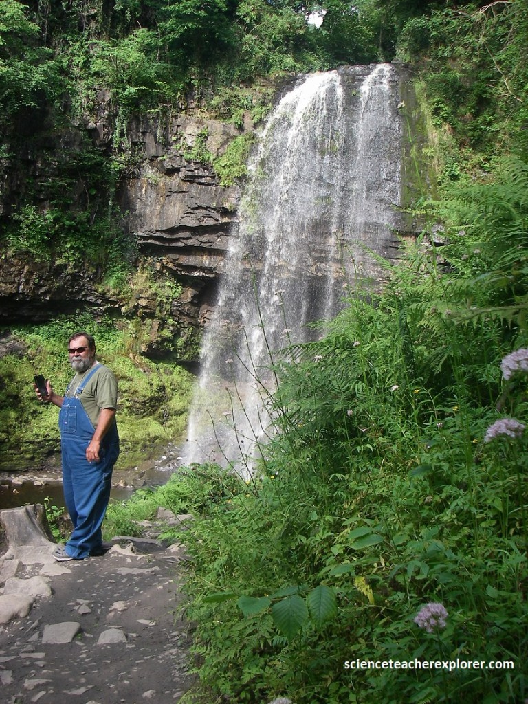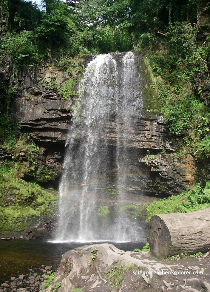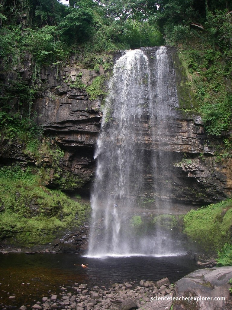 Henrhyd Falls has an unbroden drop of about 28m, making it the highest waterfall in the Brecon Beacons National Park. Pictured above, the top half of the cliff is composed of a hard, resistant, coarse-grained sandstone called the Farewell Formation, which defines the edge of the South Wales Coal Measures. It is part of the Marros Group, formerly known as the Millstone Grit series.