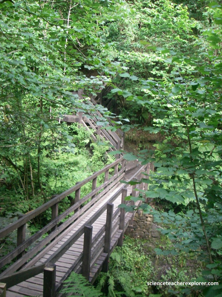 At the car park, we headed down the slope past the signboard that detailed the history of Henrhyd Falls. The slope was quite steep down to the bottom of the gorge. Here we crossed the river to the other side of the gorge on a wooden bridge.