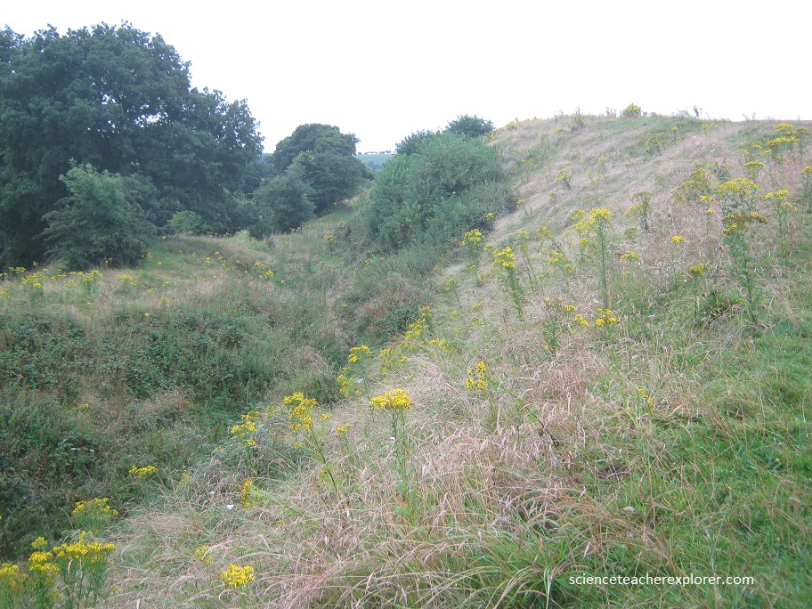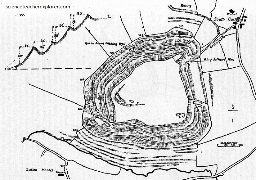 Imaged above, the plan of Cadbury Castle shows it’s complex defences, four sets of ditches and three entrances. The two main entrances had gate houses and breastworks to outflank attackers. As mentioned above, the hill was first occupied in the Neolithic period. A modest Bronze Age settlement flourished on the summit and grew during the Iron Age into a large and spectacular hill fort town, (a center of craft, trade and religious worship). The place was probably a ‘capital’ of the Durotriges whose territory included central and southern Somerset and Dorset. Dwellings within ramparts were of wood, wattle and thatch.