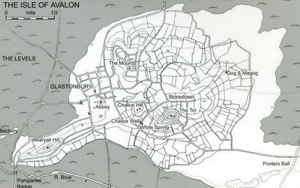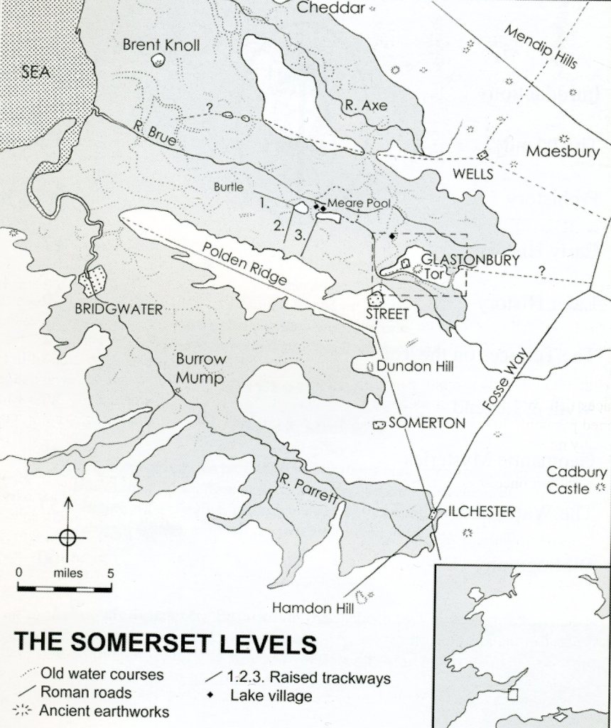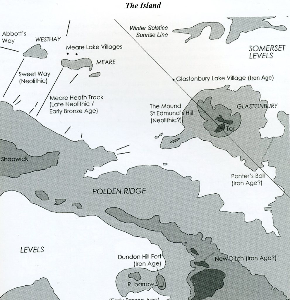 Imaged above and below, it is striking that the Glastonbury Lake Village is located precisely so it’s occupants could enjoy the sight of the midwinter sun rolling up the steep northern flank of the Tor. Their Lake Village would have been located anywhere in the large expanse of water and reed beds, but these Iron Age lake-dwellers chose to position it to see the Winter Solstice sun rise over St. Edmund’s Hill and beyond it the Tor. It should be noted that Glastonbury lies about 19 km from the sea on the eastern edge of the Somerset Levels in southwest Britain. The Somerset Levels were once a great marsh and before that, when sea levels rose after the last ice Age, a shallow inland sea. This is now low, flat, peaty, farming country, subject to frequent flooding. For thousands of years Glastonbury was therefore a virtual island surrounded on three sides by the watery Levels, (imaged below).