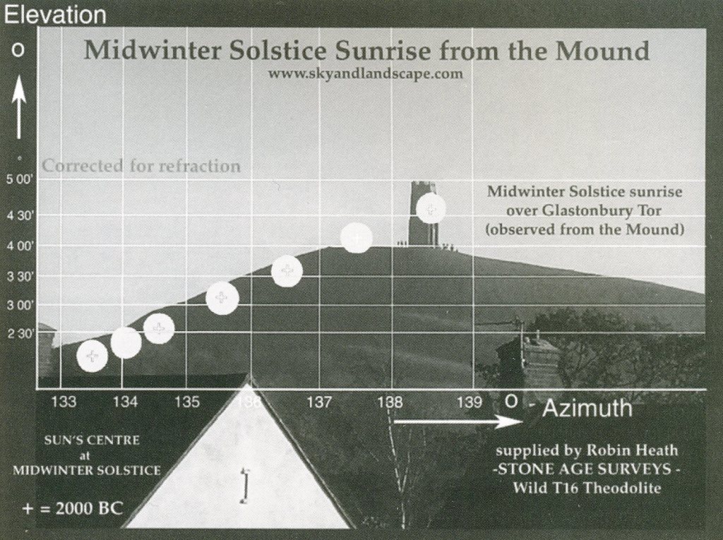 If a special aura has long been attached to Glastonbury, it is this Tor, a hill that rears up with dramatic suddenness from the flat landscape of the Somerset Levels. Recent research has revealed a curious phenomenon. When Glastonbury Tor is viewed at sunrise on December 21st, (Winter Solstice), from a mound on the summit of St. Edmund’s Hill, situated just over 1 km to the northwest, the sun rises at it’s foot and rolls up its steep northern flank. The angle of the sun’s ascent at 26 degrees is precisely marked by the angle of the slope of the Tor. This spectacular winter solstice event lasts over half an hour. Before 1600 B.C., however, the sun would have risen just below the northern flank, allowing the top rim of the rising sun to flash in any terrace carved into it. The terraces high upon the agriculturally least valuable side of the Tor may therefore have been cut for astronomical purposes at the same date as the mound, that is, before 1600 B.C. All that can be said at present is that the Tor’s uniquely dramatic form has been shaped over the millennia by a combination of geological, agricultural, astronomical, symbolic and spiritual activities, (imaged below).