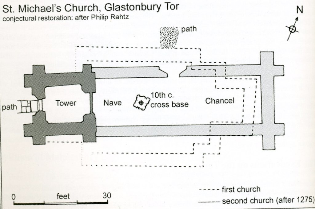 Imaged below, on the summit once stood a cluster of medieval buildings that formed the monastery of St. Michael on the Tor. Possibly founded as early as 600 A.D., but more likely by 800 A.D., this structure existed until Henry VIII dissolved the monasteries in 1539. Now all that remains is the fourteenth-century church tower. Judging from the earlier archaeological record, with evidence of iron-working and copious meat-eating, the summit of the Tor was once occupied for military purposes. The history and legends around this Dark Age “fortress” have been associated with King Arthur.