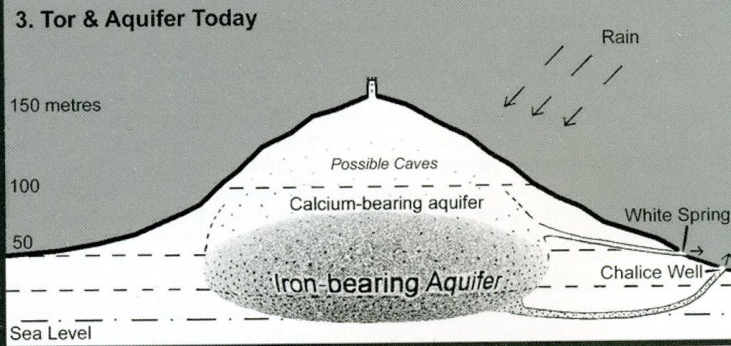 Imaged below, several Springs emerge from the Tor and at least one, the ‘White Spring’, has cut tunnels and caverns into the soft limestone. The source of the water is most likely to be rainfall, but the nature of this spring and it’s sister spring, the minerally very different ‘Chalice Well, suggests the water takes a highly unusual course below ground.